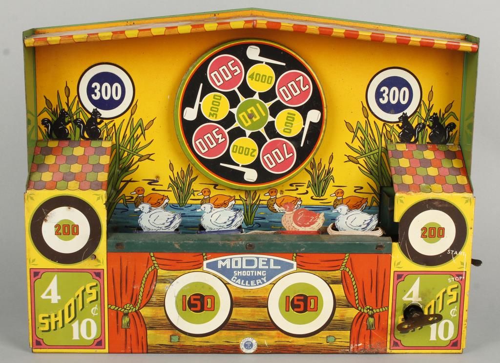 "4 Shots for 10 cents", duck gallery with four ducks, missing the gun, key is present in overall fair condition.