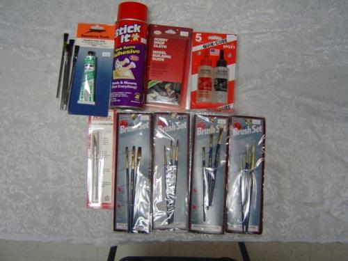 Asst Model building Supply , Paint & Brushes, glue, knife , putty, drop cloth