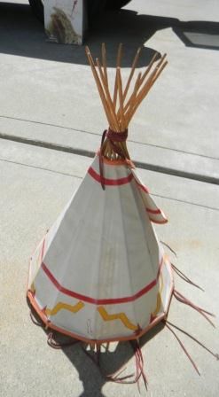 Plains Cloth wood and leather model TeePee. This was made in 1960. This was made from a lamp shade. Fine condition. Shipping $20.00.