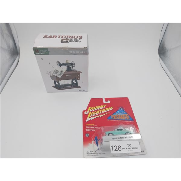 Sartorious Sewing Machine Music Box and Johnny Lightning 1957 Chevy Belair