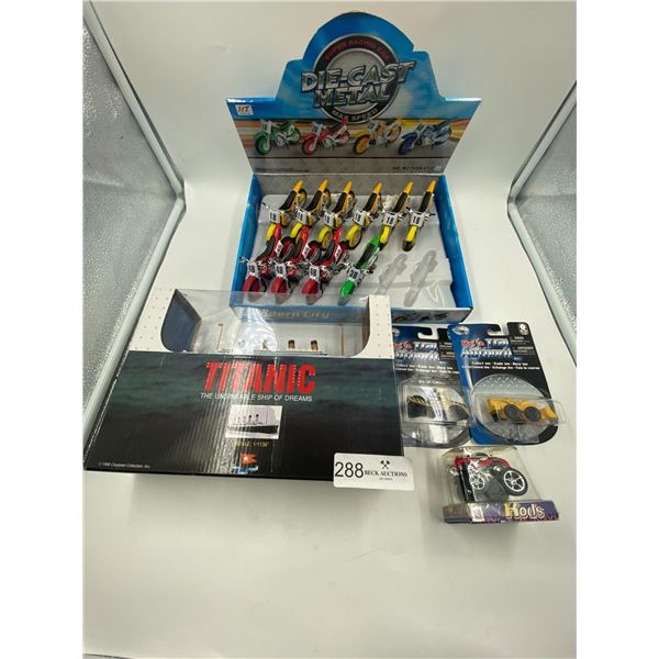 Diecast Collectible Lot of Motor Bikes and Titanic Ship Plus Work Vehicles