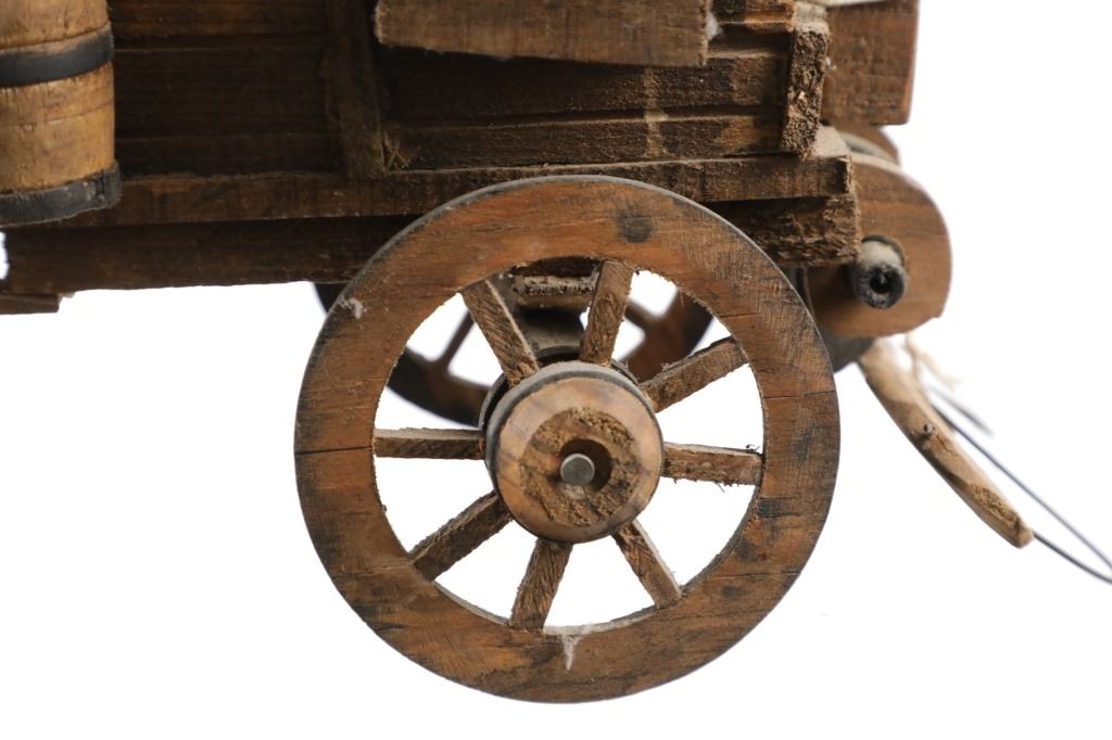 Featured in this lot is this model of a covered Conestoga wagon circa mid to late 1900s. The Conestoga wagon is a specific design of heavy covered wagons that were used extensively during the late 18th century and early 19th century in the eastern United States and Canada. It was large enough to transport loads up to 5.4 tons and was drawn by horses, mules or oxen. The Conestoga wagon was built with its floor curved upward to prevent the contents from tipping and shifting. Including its tongue, the average Conestoga wagon was 18 feet long, 11 feet high and 4 feet in width. The wagon model features the iconic curved canvas top and is constructed completely of wood and thin metal rods. It features a small model rifle and black powder horn along with a wood barrel, a wood crate and wood tools on the sides of the wagon. The front of the wagon has the tongue and the hook-ups for being pulled by horses, mules or oxen. The tongue moves freely from side to side. This model wagon is in fair condition and shows wear from its age and use over the years, but gives the wagon its authentic, vintage look. The wagon measures 20 3/8" L x 7" W x 12 1/2" H and weighs 2 pounds and 2 ounces.