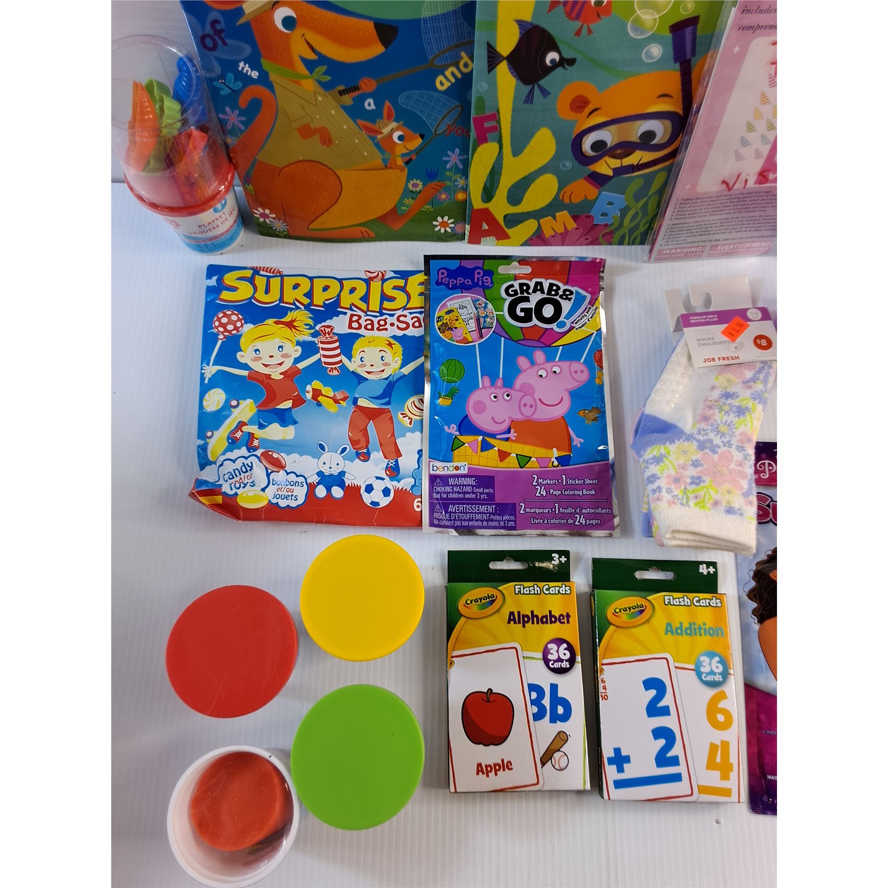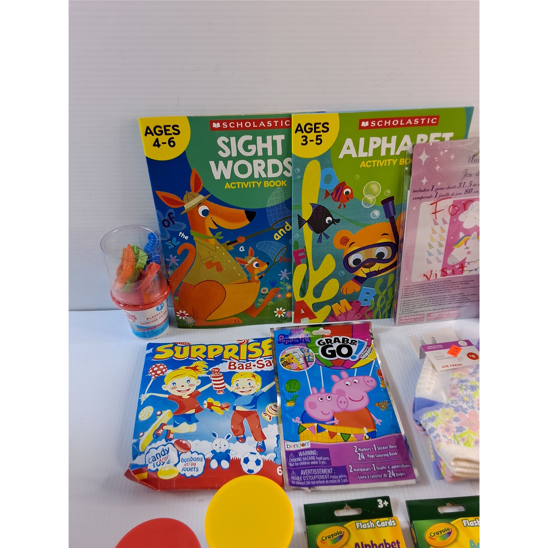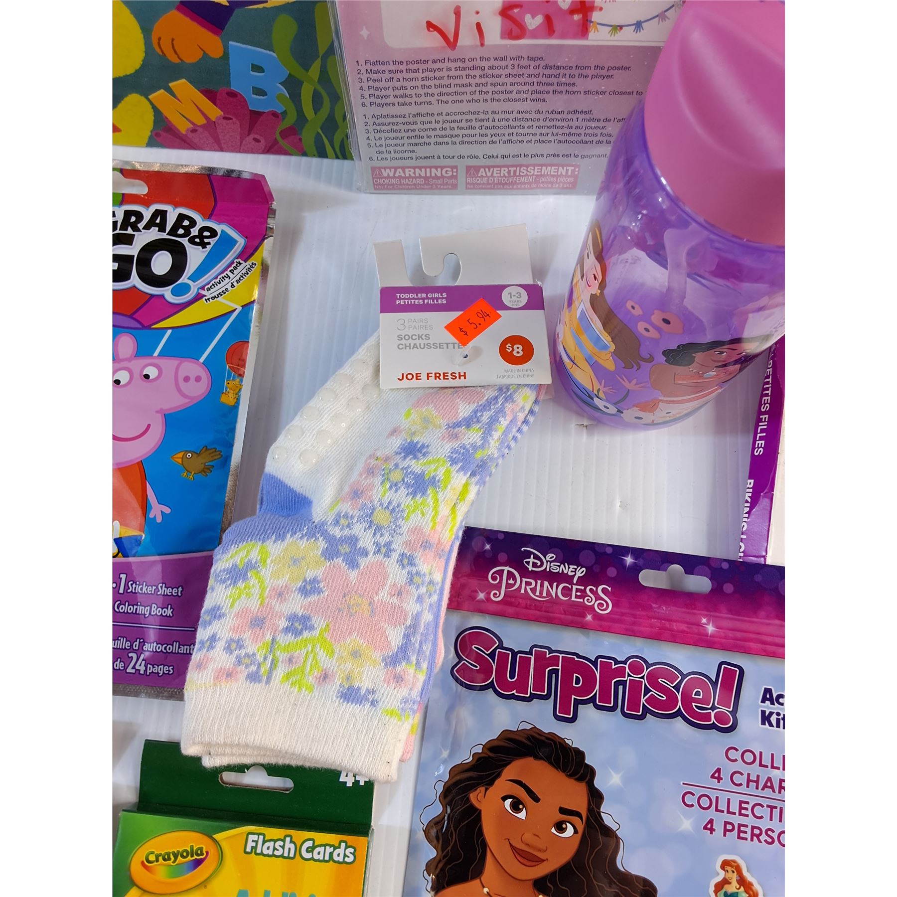 Modeling Dough, Activity Books, Water Bottle, Toddler's Socks and Bikini, Crayons and Misc