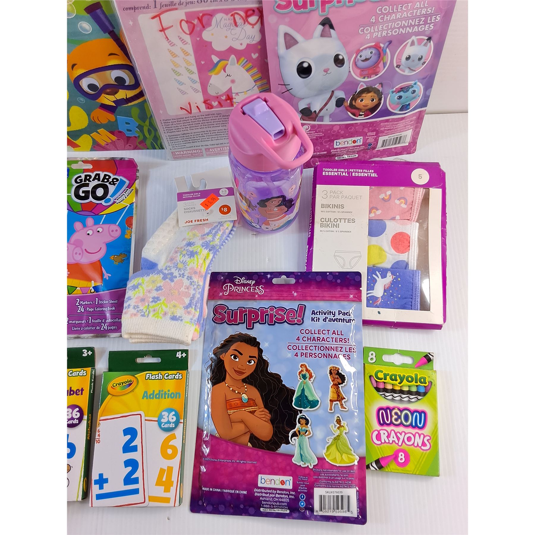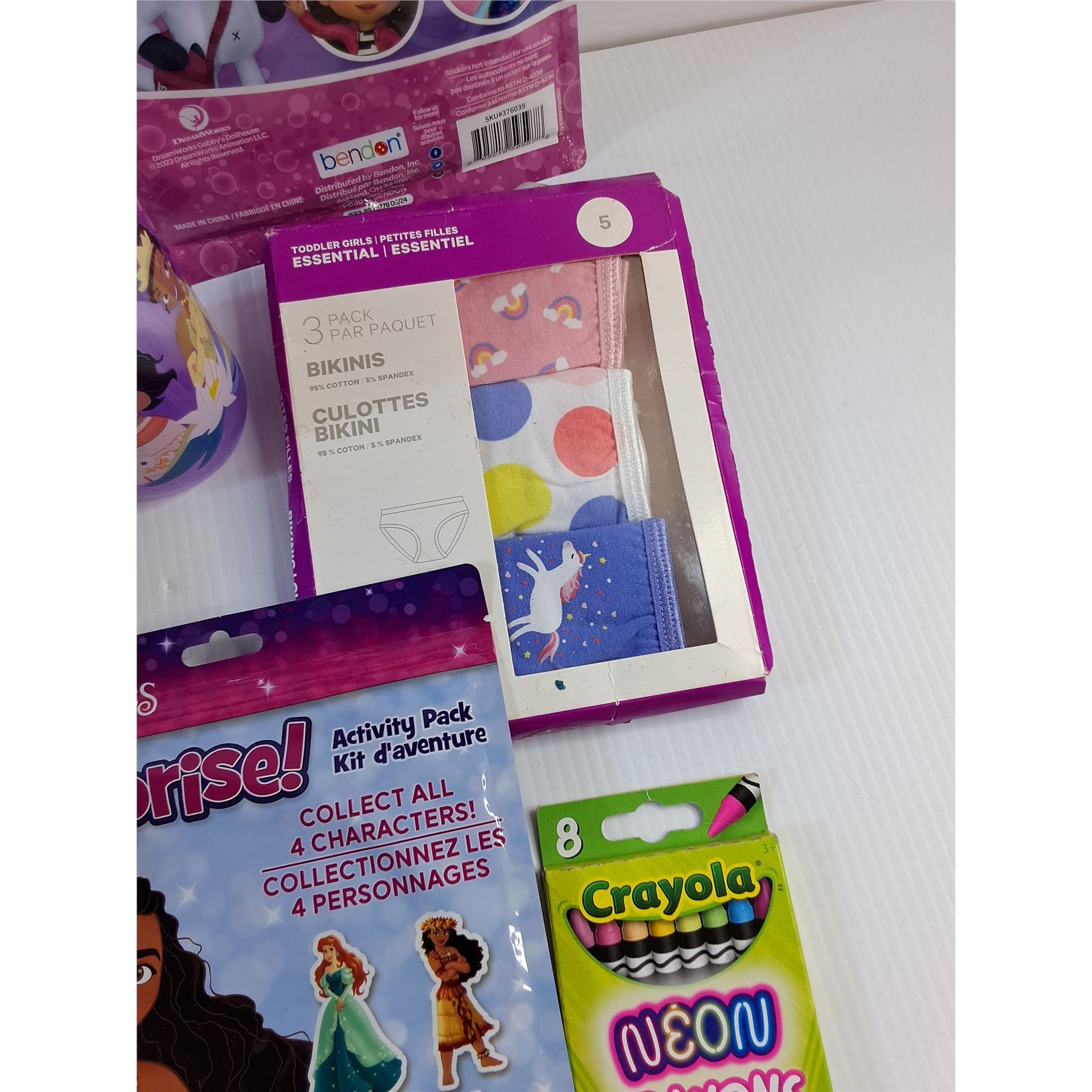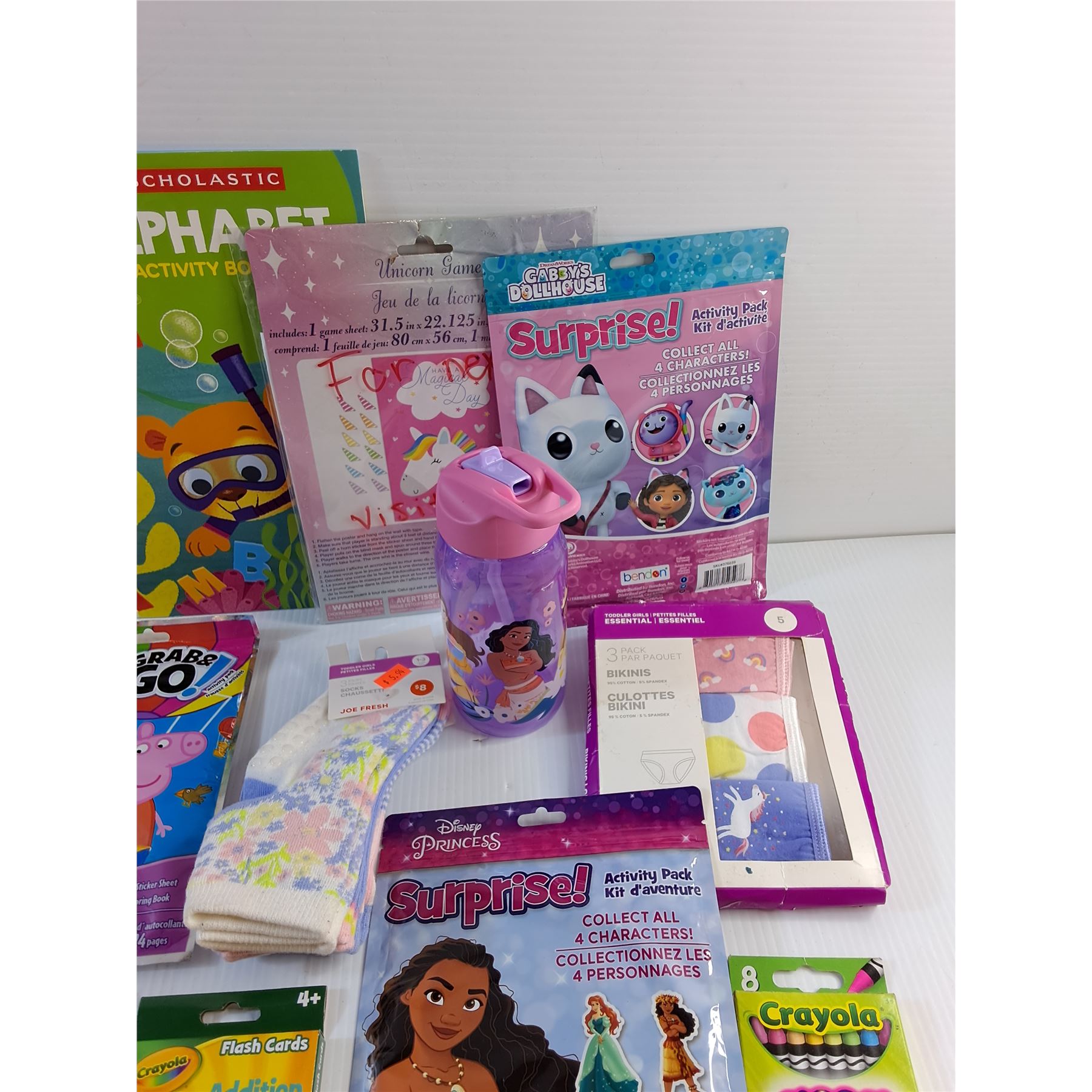 Modeling Dough, Activity Books, Water Bottle, Toddler's Socks and Bikini, Crayons and Misc