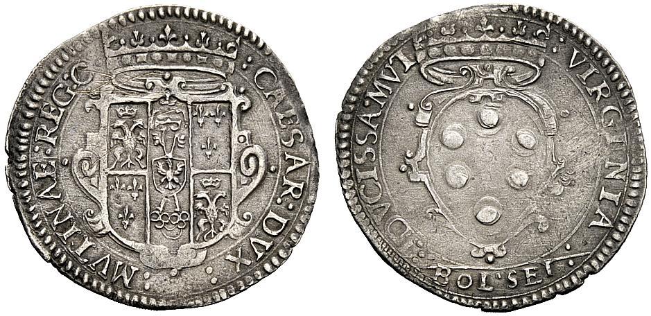 Modena. Cesare d’Este e Virginia de’Medici, 1598-1615. Da 6 bolognini o giulio, AR 2,87g. Stemma estense coronato. Rv. Stemma de’Medici coronato. CNI –. MIR 711. Molto raro. Leggera patina, buon BB