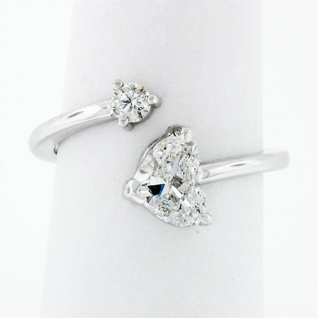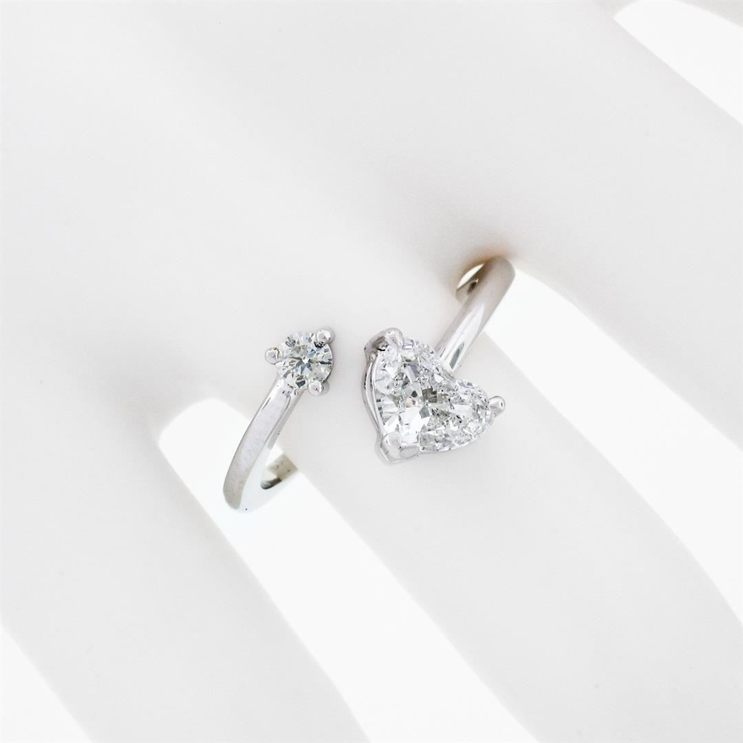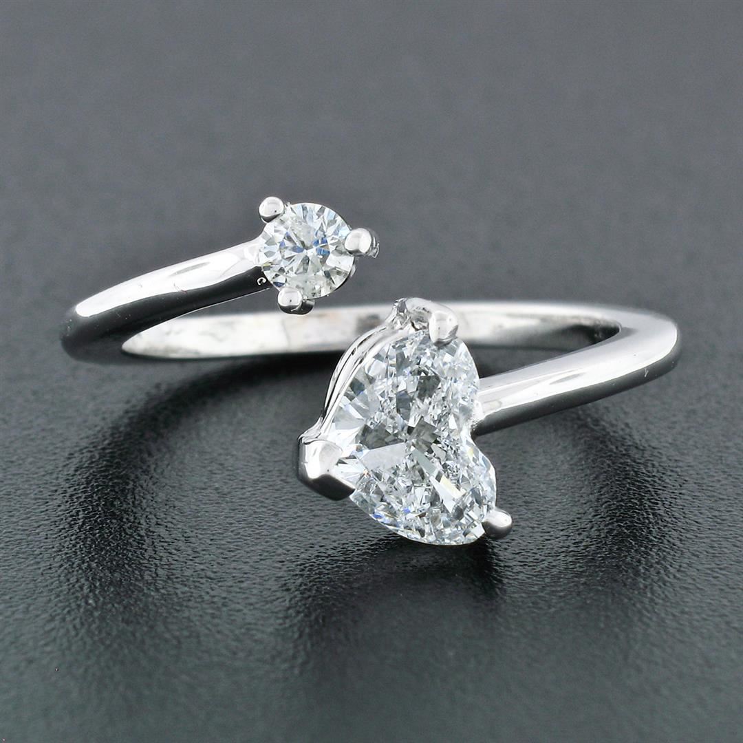A modern solid 14k white gold bypass ring with 1 GIA certified heart cut natural diamond (D - VS1; 0.71ct) and 1 round brilliant cut natural diamond (G - VS2; 0.13ct). The ring is size 7.0, weighs a total of 3.35 grams, and measures 12.5mm wide. Comes with all original relevant certifications.