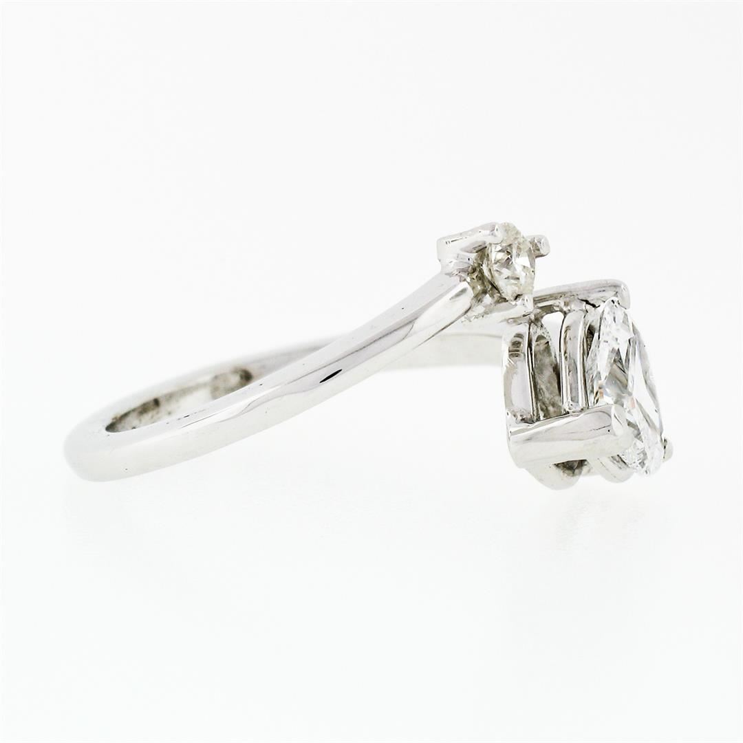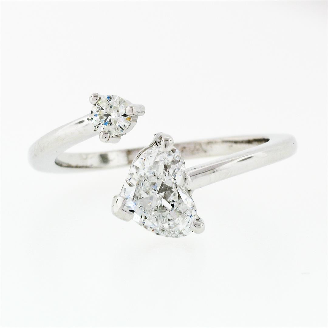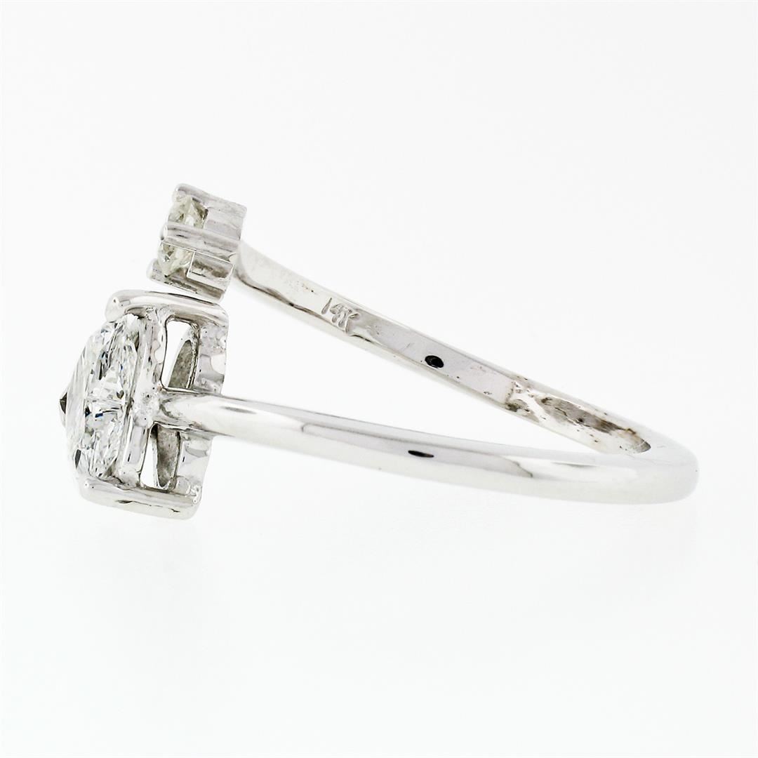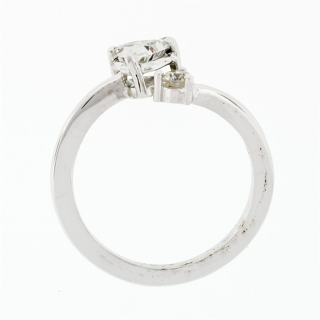 A modern solid 14k white gold bypass ring with 1 GIA certified heart cut natural diamond (D - VS1; 0.71ct) and 1 round brilliant cut natural diamond (G - VS2; 0.13ct). The ring is size 7.0, weighs a total of 3.35 grams, and measures 12.5mm wide. Comes with all original relevant certifications.