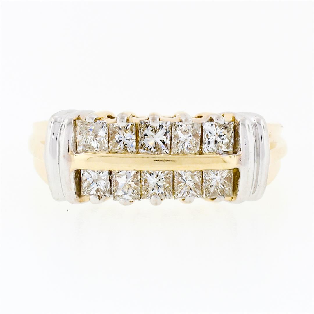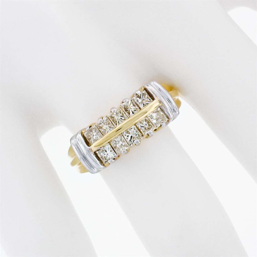 An estate solid 14k yellow & white gold wide band ring, featuring 10 princess cut natural diamonds (J/K Color - VS2-SI2 ; 1.10ctw). The ring is size 7, weighs a total of 4.85 grams, and measures 7.40mm wide.