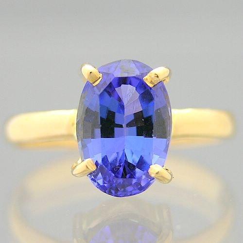 A lady's modern 18 kt. yellow gold tanzanite ring. The mounting is a plain and polished four (4) claw design with the shoulders rounded. The center is set with an oval cut genuine tanzanite. This gauges 9.1 mm. (length) x 6.3 mm. (width) x 4.75 mm. (depth) and weighs approx. 1.82 cts. The colour is medium deep very slightly violetish royal blue with moderately strong pinkish purple pleschroism and the stone is relatively free of inclusions.