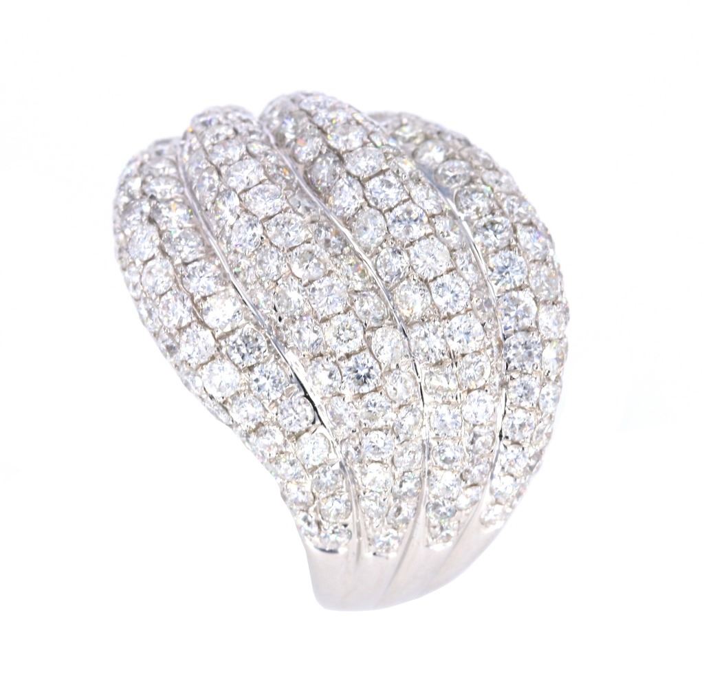 The lot features an astounding Modern Designer style 18K gold ring set with 2.86 carats of natural Diamonds. The ring has a pave set rolling wave design being set overall with 204 round brilliant cut Diamonds having a unique four curved ridge design which tapers down to the polished band. The piece is supported by a lattice under gallery and is truly a custom designer ring. The piece is hallmarked 18K and CJ showing a gold weight of 8.49 grams and a size of 7 US.