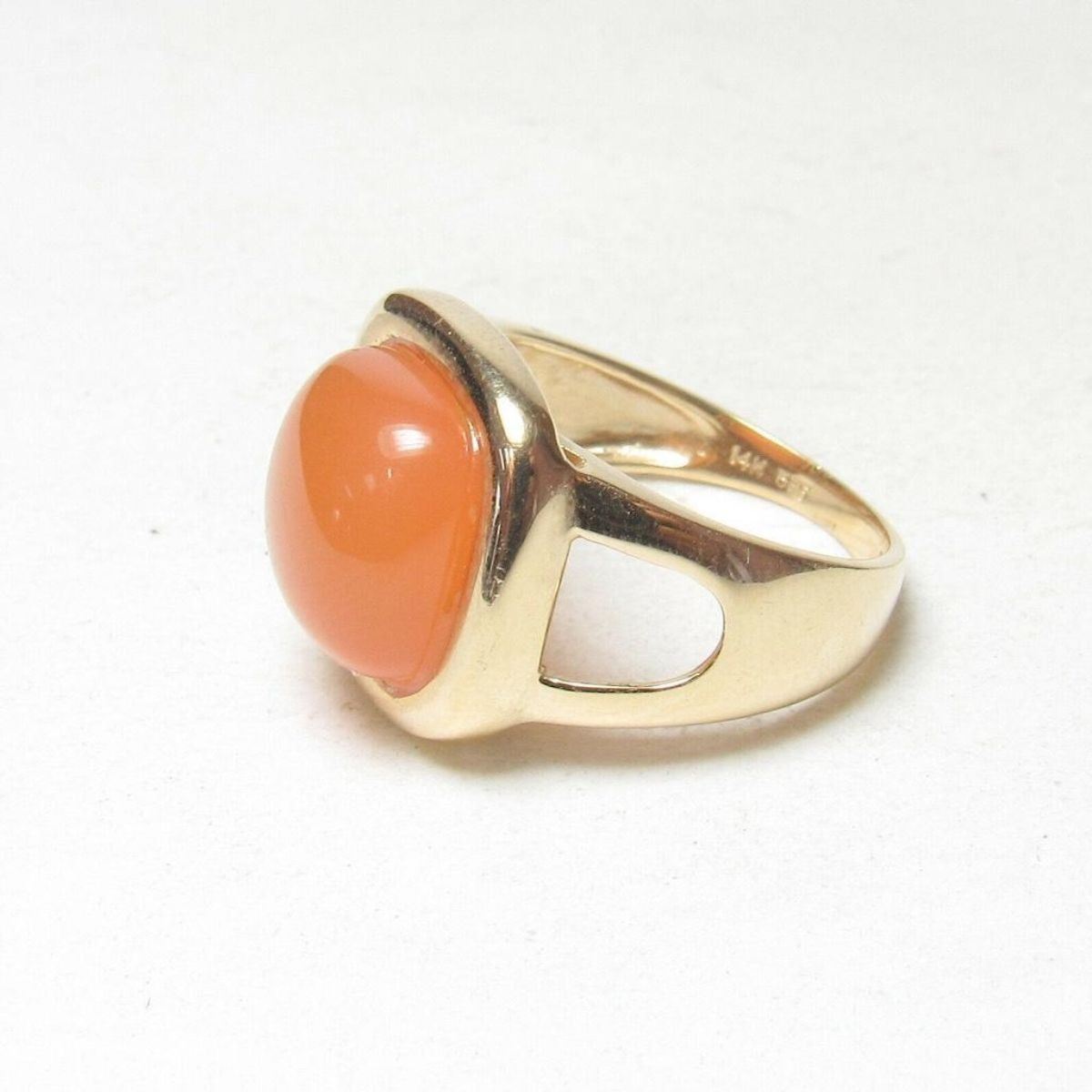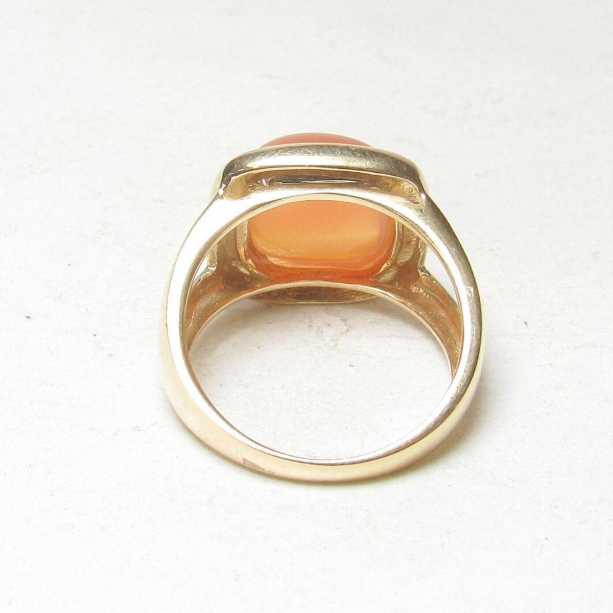 Contemporary style 14kt yellow gold with 4.25ct natural orange carnelian agate square cushion shaped solitaire ring. Size 7. 1/2" north to south. 5.7 grams.Â