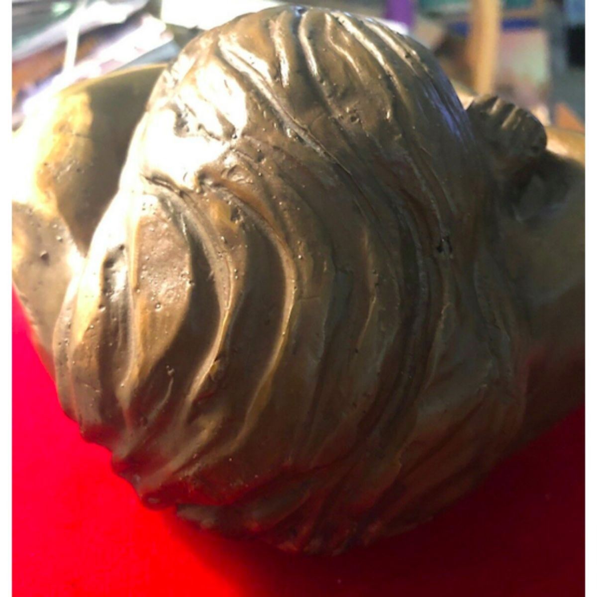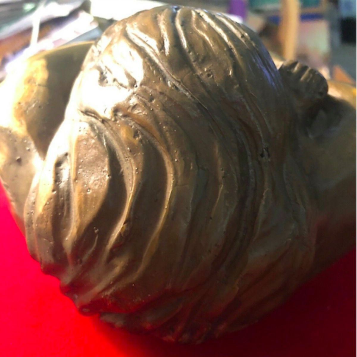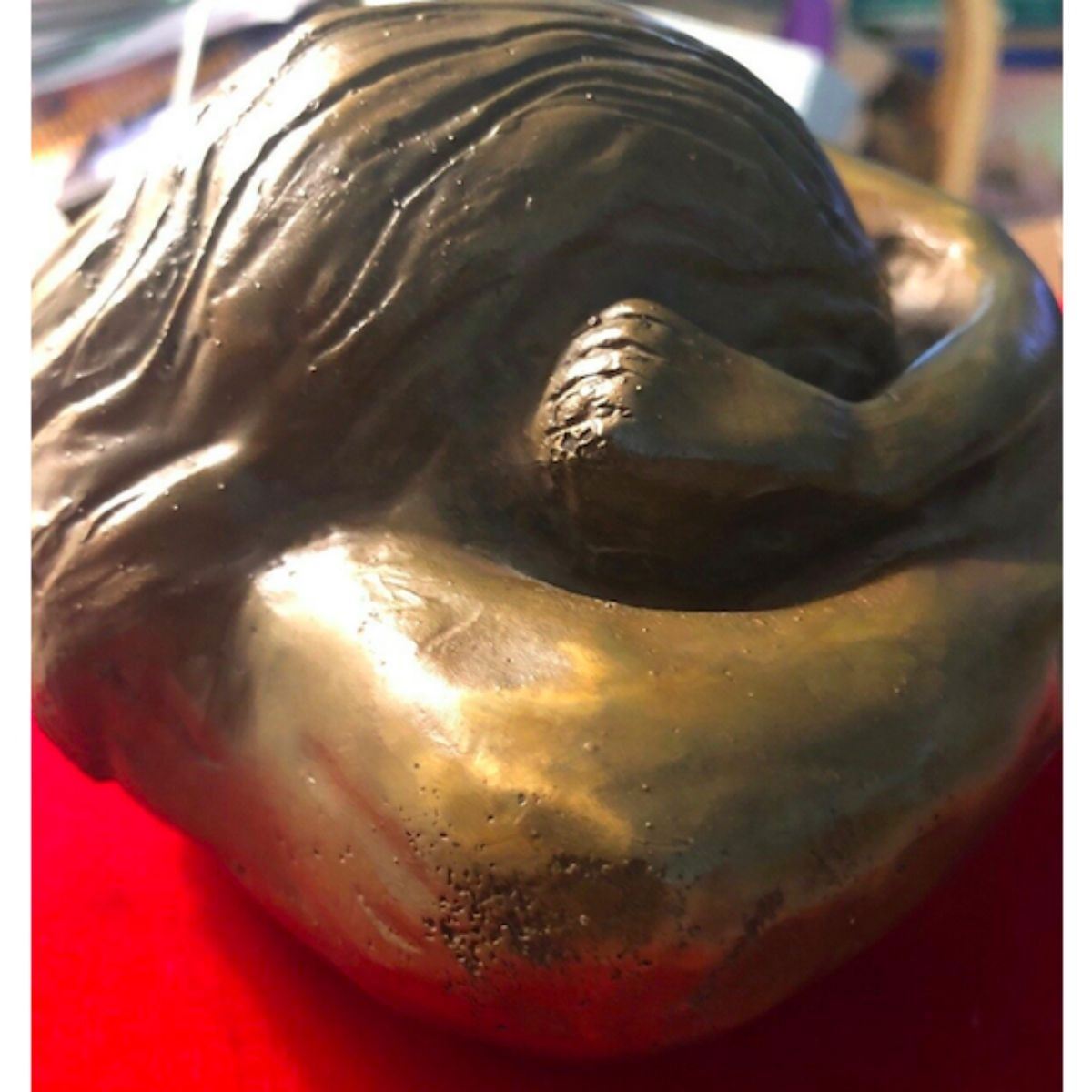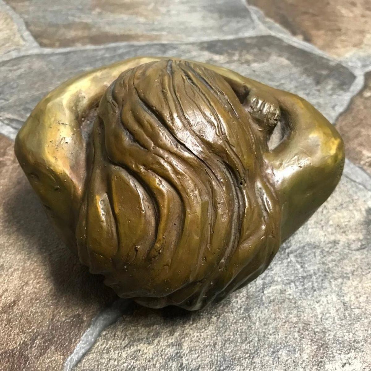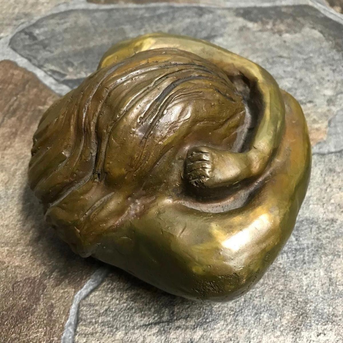 Modern, abstract-style bronze sculpture. Self Embrace. Signed by the artist in initials I O 81. 6 1/2" W X 6" L X 4" H. 4lb weight.