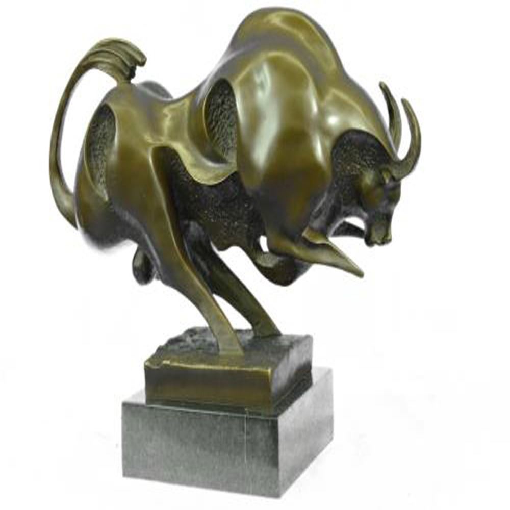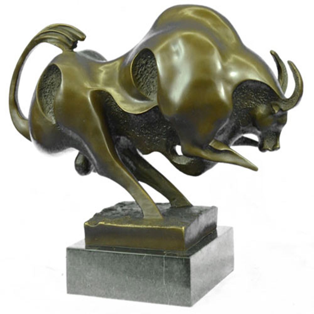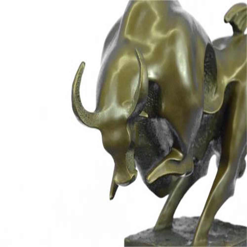 This magnificent modern and abstract sculpture is of a charging bull. With his head down, his nostrils flared and his muscles tightened he rears up to stomp the ground before him, releasing a vibrating grunt, he makes his presence known. All he see now is red and he is raging angry, his horns are sharp and solid and he prepares to charge his nemesis and take him down. He is an extremely muscular and dense creature, thick rolls of muscle curl around his neck for protection, he was made for these sorts of confrontations of physical strength. His tail curls up in a swift motion and off he goes, frozen in his pose and replicated in a true masterpiece of bronze artwork. This modern and abstract piece is perfect for a modern based theme and resting on a marble base this sculpture has a two tone brown patina and is cast using the ancient Lost Wax Method. Dimensions: Height 10 X Width 13 inches. Weight: 17 LBS.