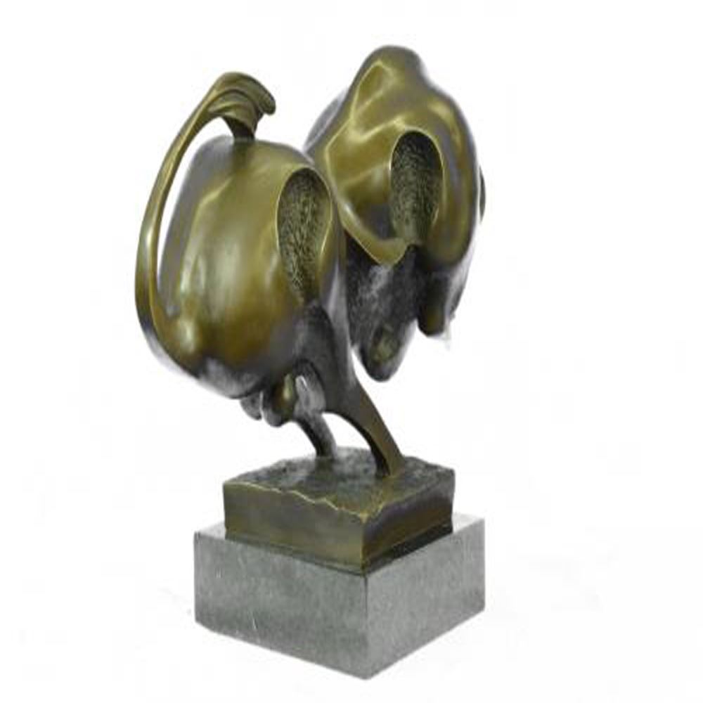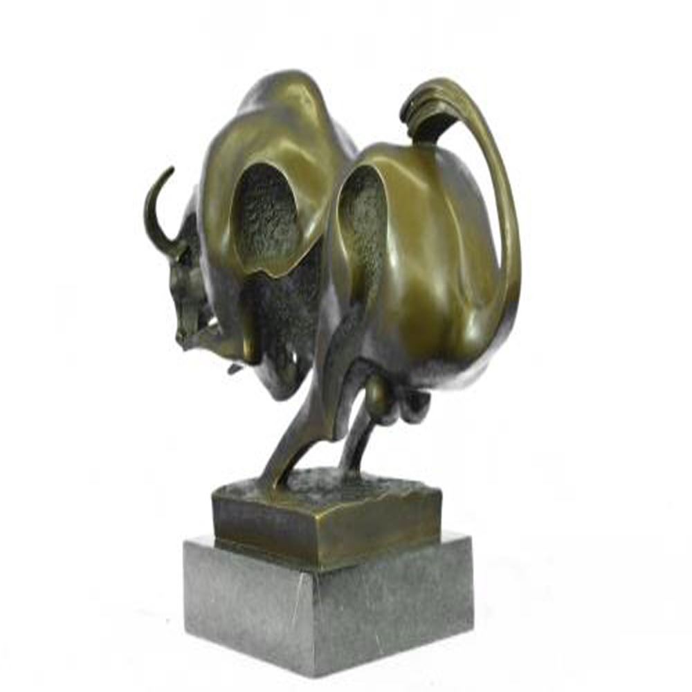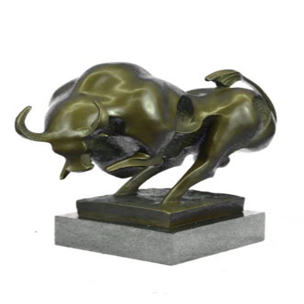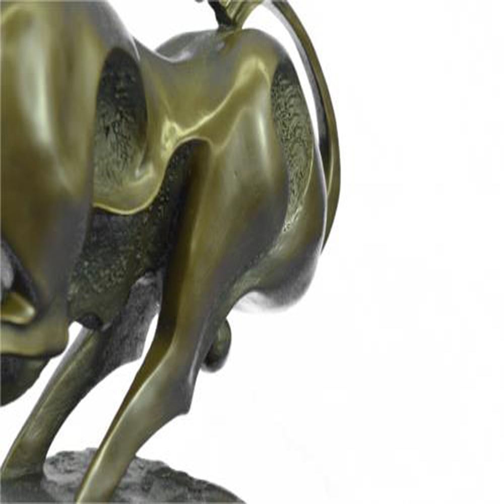 This magnificent modern and abstract sculpture is of a charging bull. With his head down, his nostrils flared and his muscles tightened he rears up to stomp the ground before him, releasing a vibrating grunt, he makes his presence known. All he see now is red and he is raging angry, his horns are sharp and solid and he prepares to charge his nemesis and take him down. He is an extremely muscular and dense creature, thick rolls of muscle curl around his neck for protection, he was made for these sorts of confrontations of physical strength. His tail curls up in a swift motion and off he goes, frozen in his pose and replicated in a true masterpiece of bronze artwork. This modern and abstract piece is perfect for a modern based theme and resting on a marble base this sculpture has a two tone brown patina and is cast using the ancient Lost Wax Method. Dimensions: Height 10 X Width 13 inches. Weight: 17 LBS.