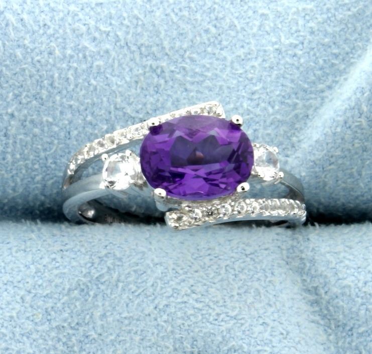 Genuine 7x9mm Amethyst gemstone ring set horizontally with two 3mm White Sapphire gems on the side,. The lines of white sapphires above and below give a modern and flattering to the finger look to this ring. Size 7 3.0g
