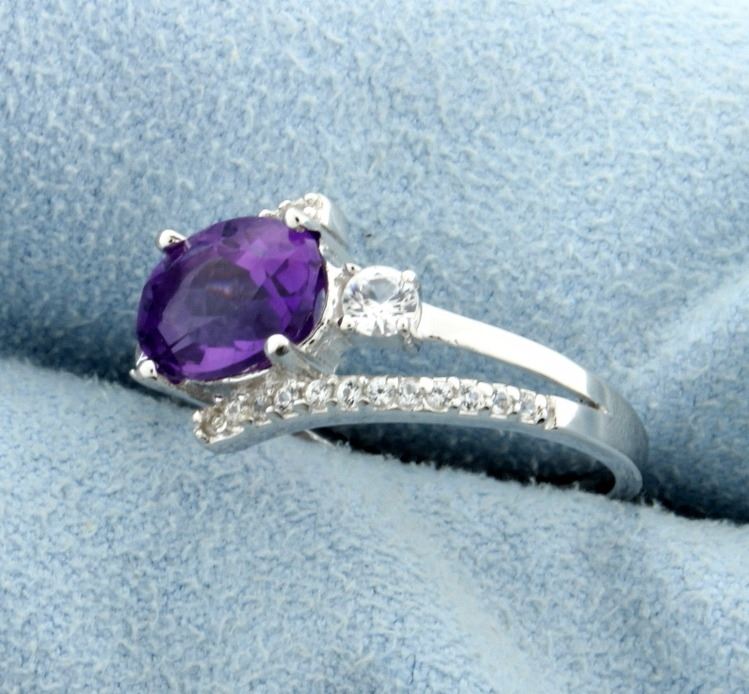 Genuine 7x9mm Amethyst gemstone ring set horizontally with two 3mm White Sapphire gems on the side,. The lines of white sapphires above and below give a modern and flattering to the finger look to this ring. Size 7 3.0g