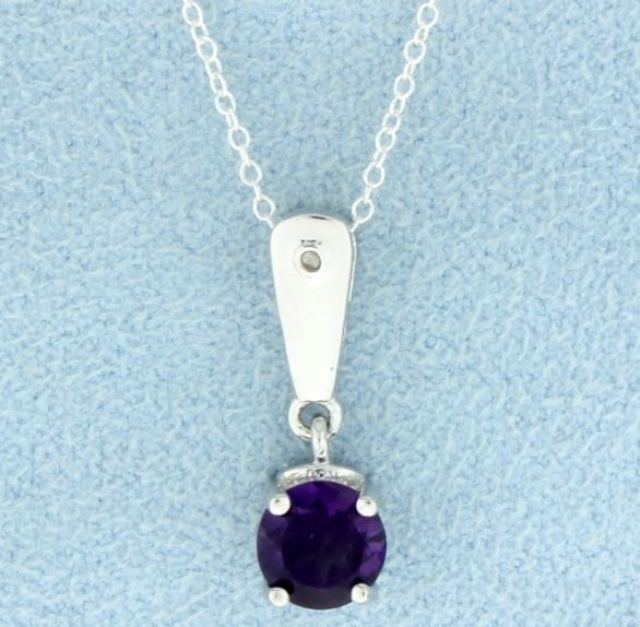 The pendant has a round amethyst gemstone and a bezel set diamond that are in platinum over sterling silver on a 18" sterling silver chain. 1.8g