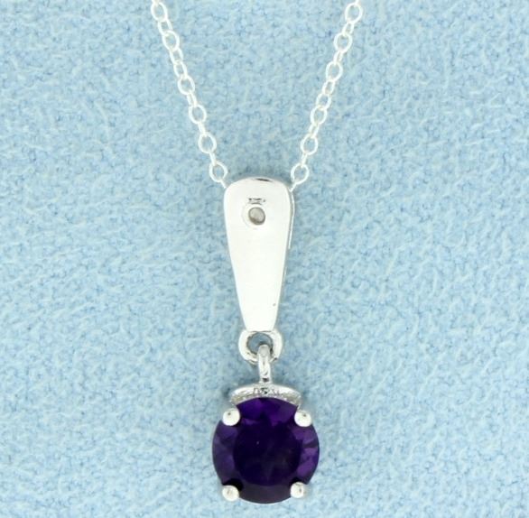 The pendant has a round amethyst gemstone and a bezel set diamond that are in platinum over sterling silver on a 18" sterling silver chain.     1.8g