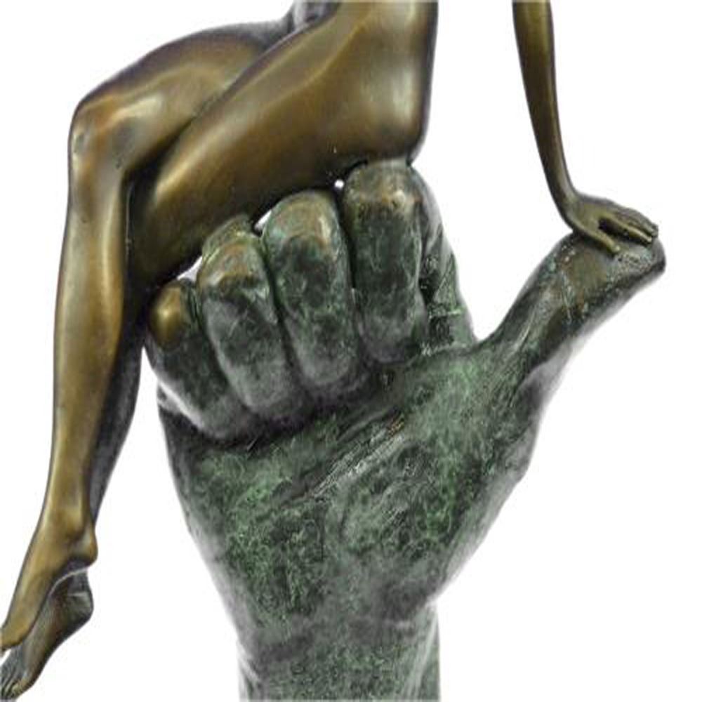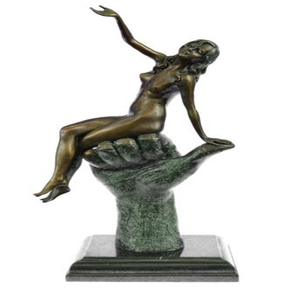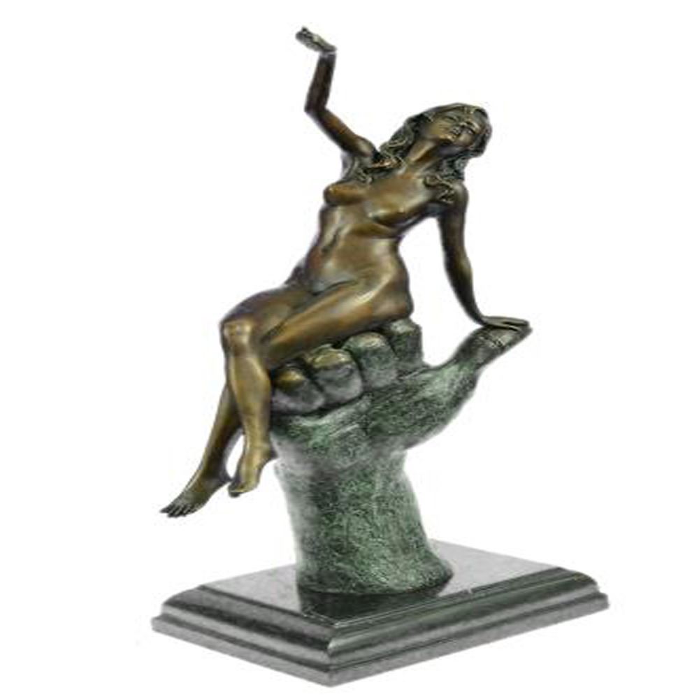 Stunning quality bronze sculpture depicting a naked lady in a seductive pose. The lady is sat on top of an oversized hand, this bronze has a mild erotic undertone. Lovely patination, a rich brown for the hand contrasting against a gilt effect for the lady. This is a genuine hot cast bronze finished on a marble base. Dimensions: Height 15 X Width 8 inches. Weight: 9 LBS.