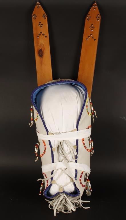 Indian made with beaded circles with center conchos. Cradleboard itself is only tied on with fabric.