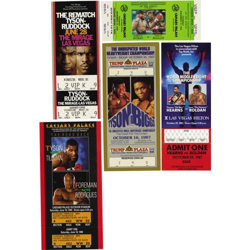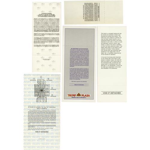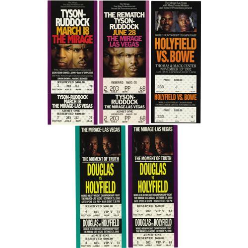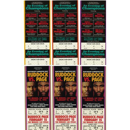 <B>Modern Boxing Tickets Lot of 16.</B></I> A beautiful lot of full, unused tickets to some of the most memorable fights held during the past 25 years. This lot includes: Hagler-Duran, Tyson-Tillman, Tyson-Biggs, Tyson-Ruddock I, Tyson-Ruddock II (2), , Ruddock-Page (3), Chavez & Norris (3), Holyfield-Bowe I, Hearns-Roldan and Douglas-Holyfield (2) (Holyfield wins title). All but the Chavez ticket are illustrated and all are in excellent or better condition. <I>LOA from Craig Hamilton / JO Sports.</B></I>