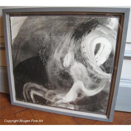 British origin, mono-type print/drawing, mixed technique, fourth quarter 20th century, illegible signature. Black ink and charcoal on etched vellum paper, signed by the artist and set in a contemporary glazed frame. Overall size is 17.7 x 16.5 inches. This superb work in sharply delineated black and gray tones seems to be a work of a certain "Pearce", judging by the pencil signature at the bottom right. It's swirling lines brings inevitably an octopus or a mammoth to mind. Probably 1990's.