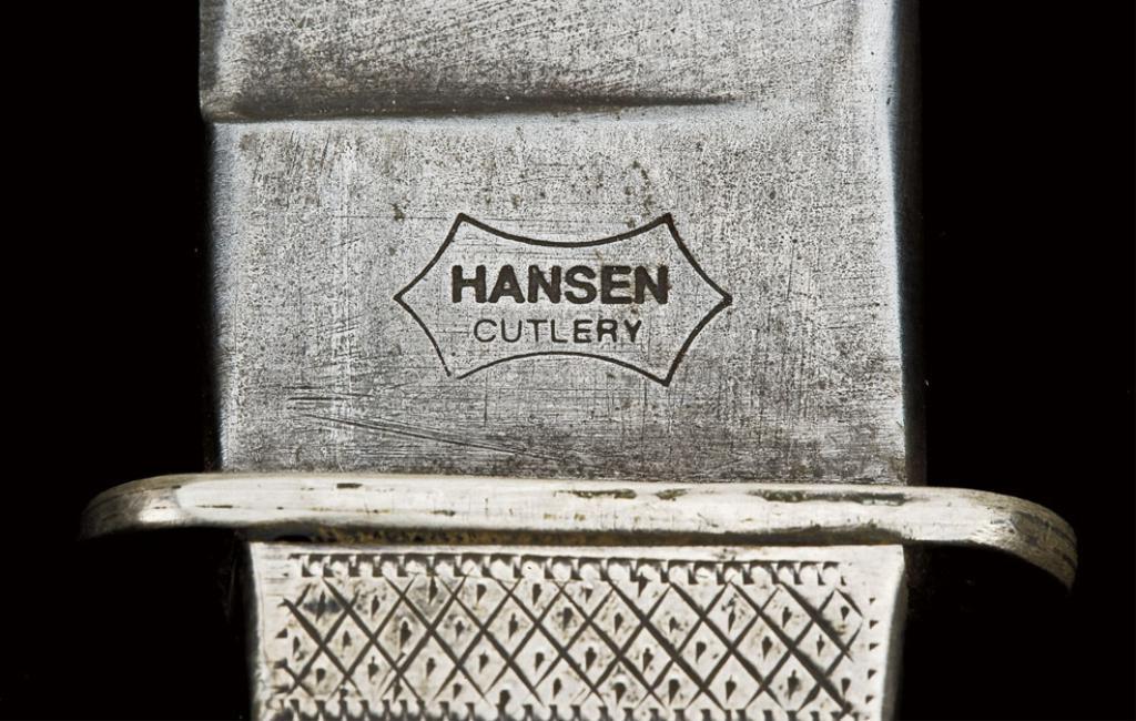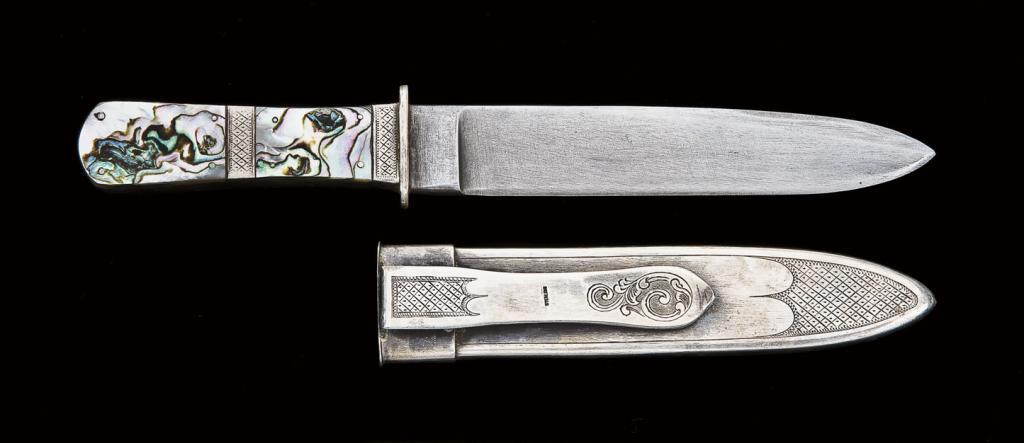 Modern California style dress dirk by Hansen cutlery with fancy engraved silver mounts, abalone scales and hand-engraved sterling marked scabbard. 9-3/4” overall with 6-1/16” spearpoint blade. Very well made and high quality throughout. Probably made in San Jose, circa approx. 1970’s. Hugh Hayes Collection. Est: $2,000 - $4,000