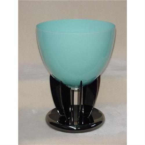 A modern design centerpiece, 11 3/4" tall, 8 3/4" in diameter. The cased glass bowl is 7 1/4" tall and 8" in diameter, blue glass cased between clear glass, sits atop the eight spokes of the metal base, 7" in dameter. Unsigned, of the 1970's-80's vintage for the truly modern enthusiast. Condition is very good, no chips on the glass and the metal base is in very good order. (7)