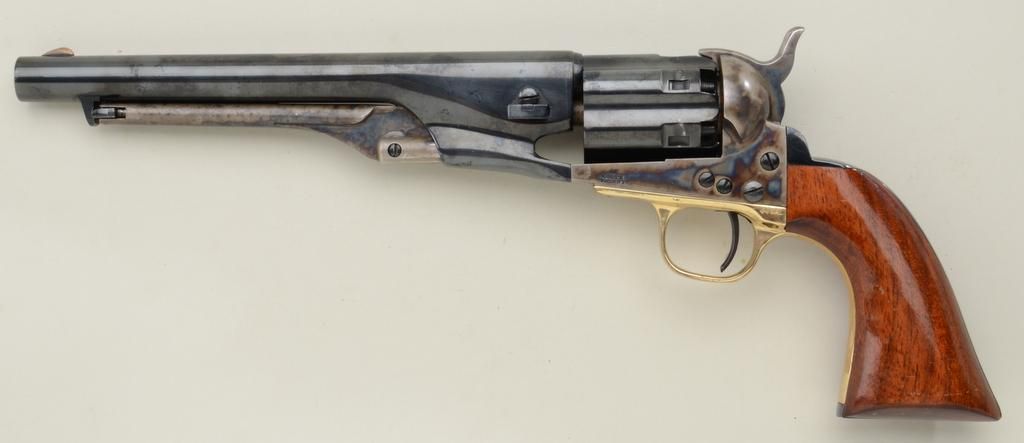 Modern Colt Blackpowder Series fluted Model 1860 Army percussion revolver with detachable shoulder stock, .44 cal., 8” barrel, blue and case hardened finish, wood grips and shoulder stock with brass fittings, #221086.This set is in overall like new condition showing little handling; contained in a custom blonde wood case. Est.: $600-$1,200.
