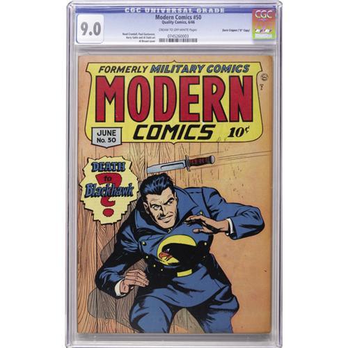 <B>Modern Comics #50 Davis Crippen ("D" Copy) pedigree (Quality, 1946) CGC VF/NM 9.0 Cream to off-white pages.</B></I> As of this writing, this is the only copy graded above FN- 5.5 by CGC. The Blackhawk cover is by Al Bryant. Overstreet 2006 VF/NM 9.0 value = $358; NM- 9.2 value = $480. CGC census 9/06: 1 in 9.0, none higher. <I>From the Crippen Collection</B></I>.<BR><BR><b>Shipping:</b> Slabbed Comic (<a target="_blank" href="http://www.heritageauctions.com/common/shipping.php">view shipping information</a>)