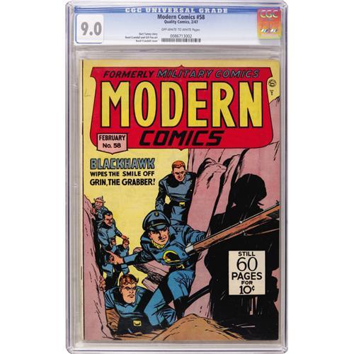 <B>Modern Comics #58 (Quality, 1947) CGC VF/NM 9.0 Off-white to white pages.</B></I> Reed Crandall cover. Crandall and Gill Fox art. Overstreet 2006 VF/NM 9.0 value = $302; NM- 9.2 value = $400. CGC census 3/07: 2 in 9.0, none higher.<BR><BR><b>Shipping:</b> Comics - Slabbed (certified) (<a target="_blank" href="http://www.heritageauctions.com/common/shipping.php">view shipping information</a>)