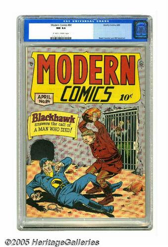 <B>Modern Comics #84 (Quality, 1949) CGC NM 9.4 Off-white to white pages.</B></I> Reed Crandall cover art, plus interior story art by Crandall, Bill Ward, and Paul Gustavson. This is the only copy to be certified by CGC to date. Overstreet 2005 NM- 9.2 value = $335. CGC census 6/05: 1 in 9.4, none higher.