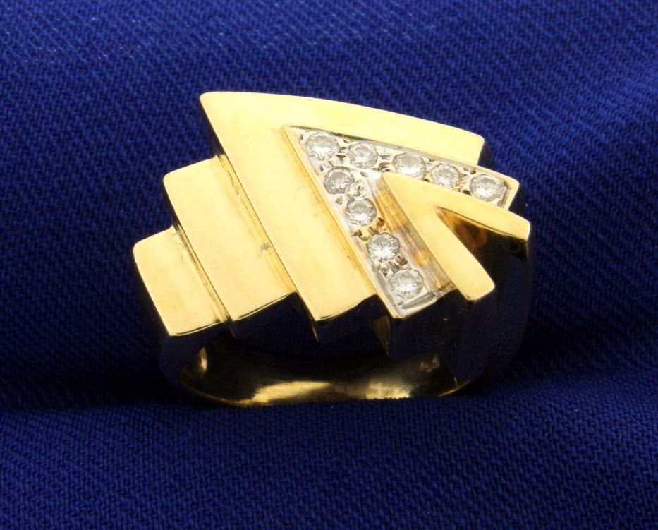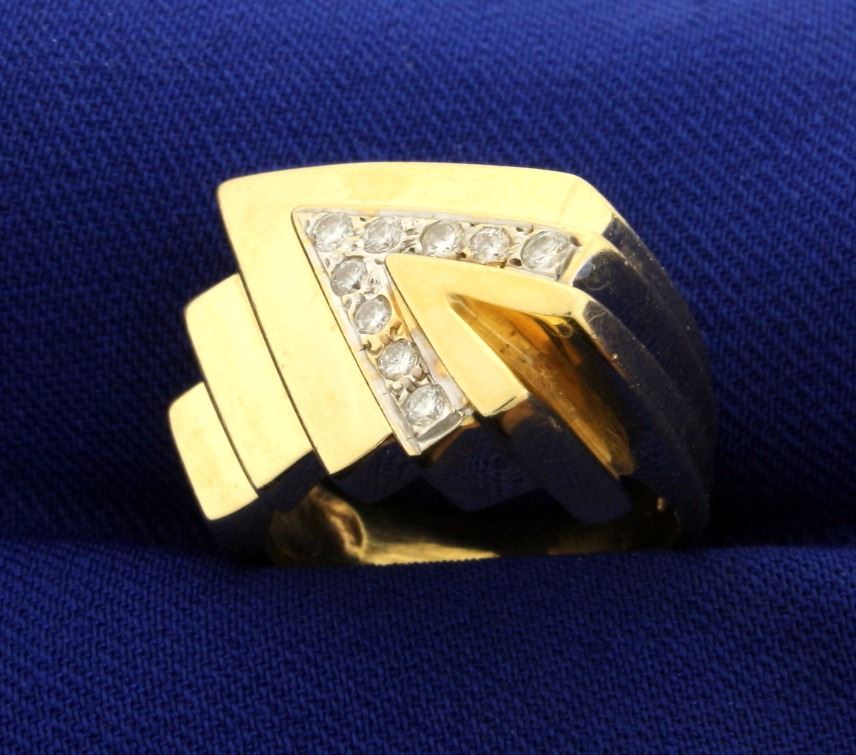 In 14k yellow gold, containing 1/4ct TW of high quality VS clarity/G color diamonds. Size 5 1/2. 11.1g.