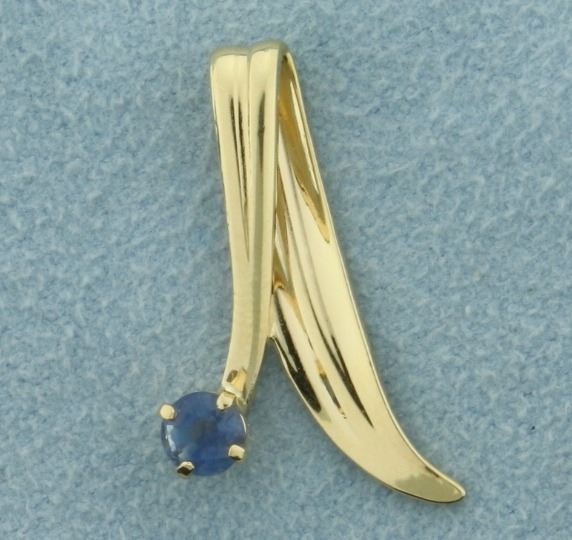 In 14K Yellow Gold. Contains a natural 4mm round Sapphire with bright blue color and excellent clarity. 1" long with bale. 2.0g