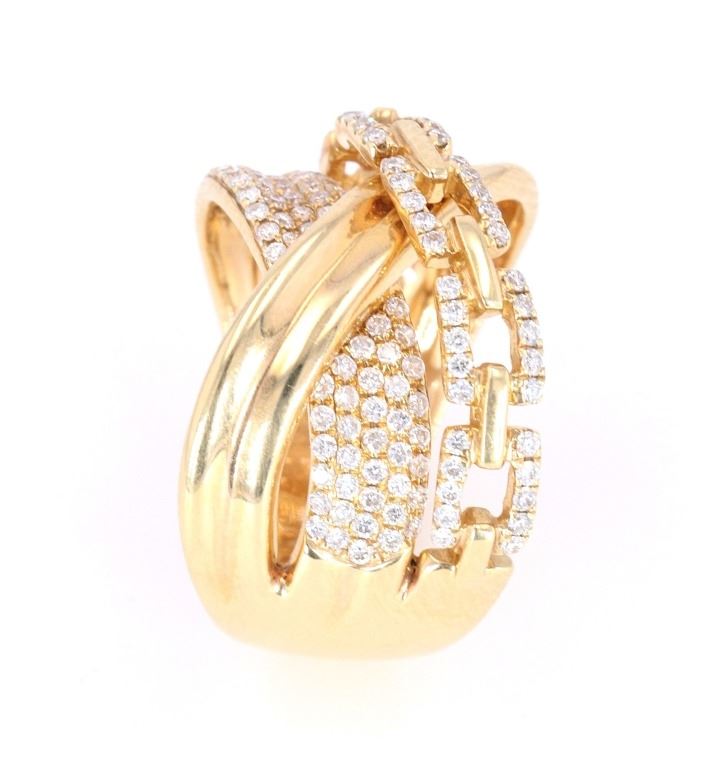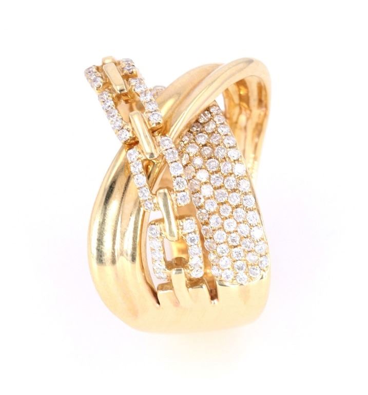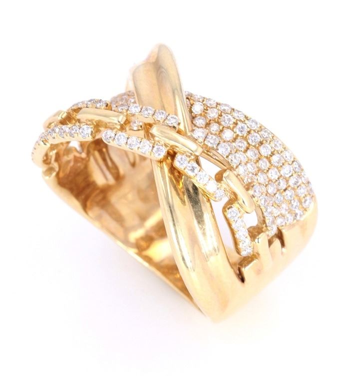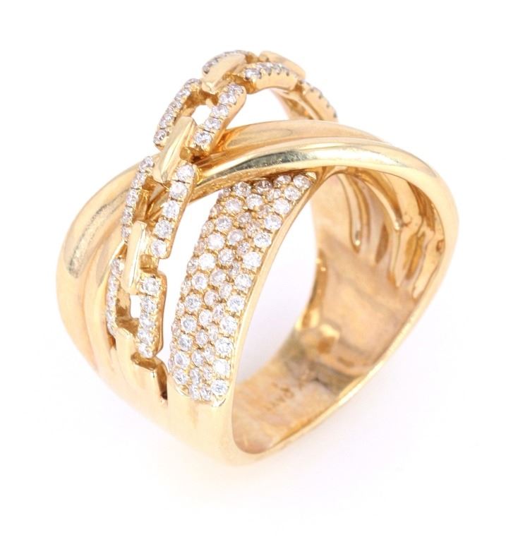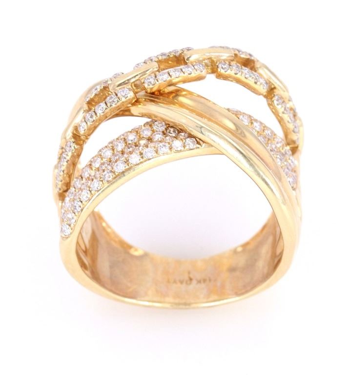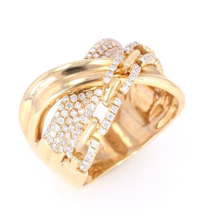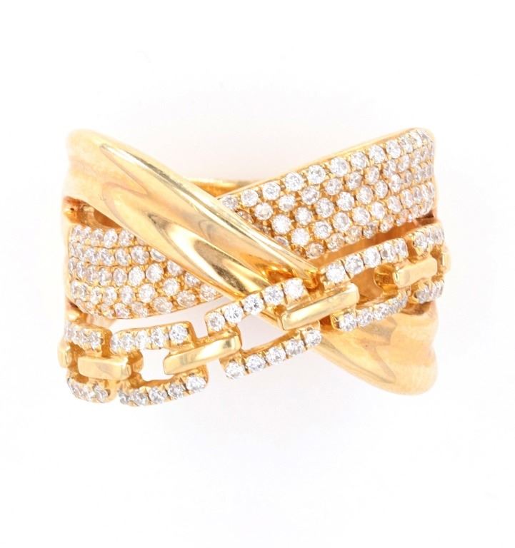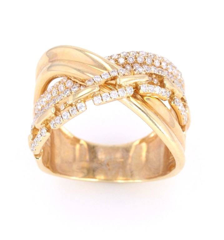 This is an unusual modern designer ring crafted of 14K gold and pave set with natural Diamonds. The ring shows a wide polished 14 karat yellow gold craftsmanship with gold weight of 8.56 grams which then flows into a triple split shoulder and infinity overlapping design. From the top the ring shows a halo bezel diamond set chain link ribbon overlapping the polished wide rolling band which overlaps the pave set wide band giving an infinity or wave modern design. In total the ring is set with 144 round brilliant cut Diamonds with a weight of 0.76 carats. The ring is stamped 14K and OAYT with a size of 7 US.