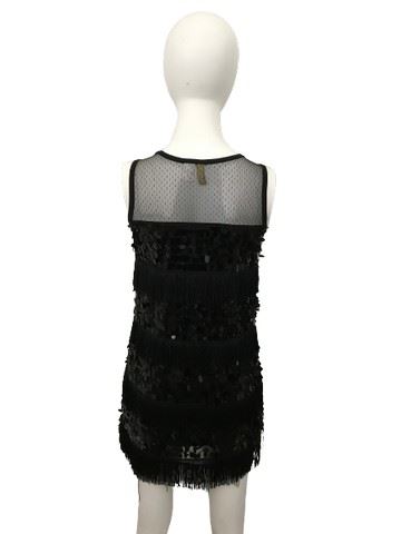 Modern flapper dress with four tiers of fringe, large round sequence and a built in see thru black top. Originally used in an unidentified film for a background character. Brand: Divided. Size xs.