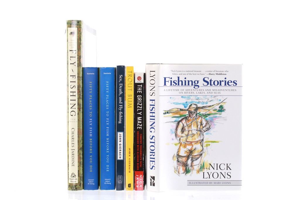 The lot collection includes six fly fishing books and the account of Timothy Treadwell, “The Grizzly Maze”. The first book in this lot is “The Classic Guide to Fly Fishing for Trout” by Charles Jardine, published by Random House (1991, Hardcover). This book is in good condition, has a dust cover, and is coffee table sized. The next two books are identical hardcover copies of “Fifty Places to Fly Fish Before You Die” by Chris Santella, with selected photographs by R. Valentine Atkinson and published by Stewart, Tabori & Chang, 2004. Both books have dust covers and are in good condition; the coloration of the covers appears different due to camera filtering. The next book is the hardcover copy of “Fishing Stories” by Nick Lyons, illustrated by Mari Lyons and published by Skyhorses Publishing in 2014. Next is the soft cover book, “Trout Bum”, by John Gierach, published by Simon & Schuster, 1986. The paperback is in good reading condition. The next paperback is “Sex, Death, and Fly-Fishing", also by John Gierach, published by Simon & Schuster in 1990. This book is in good reading condition, though the first page has been torn off. ("If Mark Twain were alive and a modern-day fly-fisherman, he still would be hard put to top John Gierach.", Sports Illustrated). The last book is the paperback, “The Grizzly Maze, Timothy Treadwell's Fatal Obsession with Alaskan Bears” by Nick Jans, published by Penguin Group, 2006. Nick Jans has been a contributing editor for Alaska Magazine. The book is in fair to good reading condition. The largest book measures 11 1/2" L x 9.25" W x .5" D; the smallest measures 8" L x 5.25" W x .75" D.