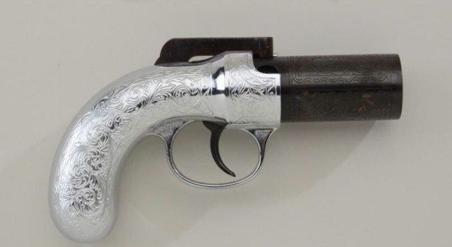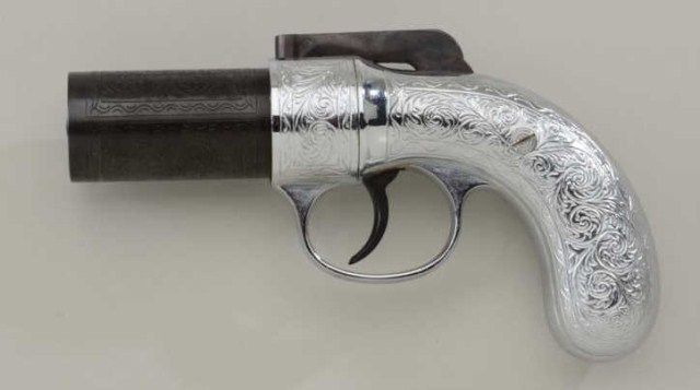 Modern Gold Rush percussion pepperbox blackpowder pistol copy in like new condition in cardboard box with instructions, .22 caliber. Est.: $50-$75.
