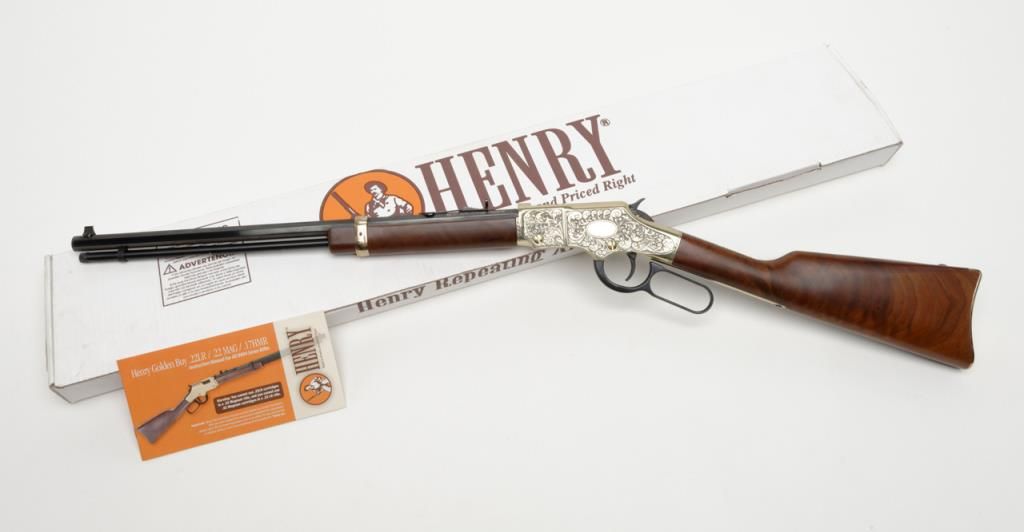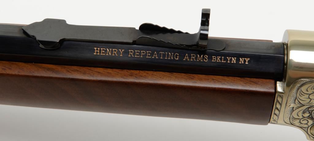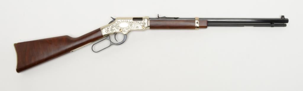 Modern Henry Repeating Arms Co. lever action rifle, .22 Magnum cal., 20” octagon barrel, blue finish to barrel and loading tube, engraved frame with gold colored finish, wood stocks, #GB0811MD in like new condition in factory cardboard box.(Modern/PPT). Est.: $1,000-$2,000.