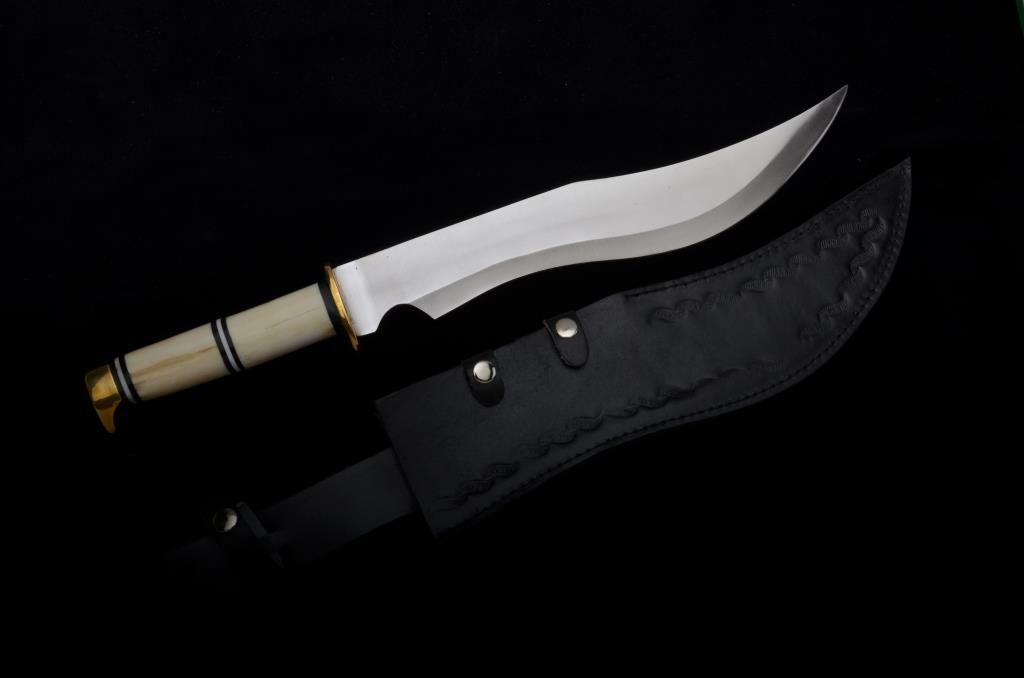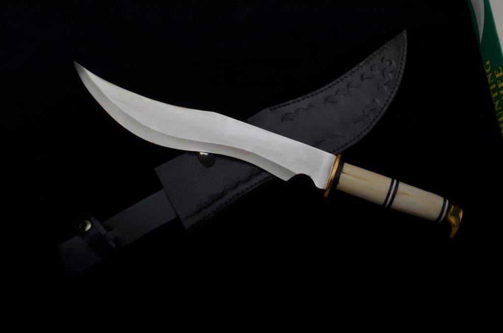 Modern Hunting knife with leather sheath, unmarked, approx. 18-1/2” overall with a 12-1/2” blade in like new condition, bone grip with cardboard box. Est.: $100-$150.