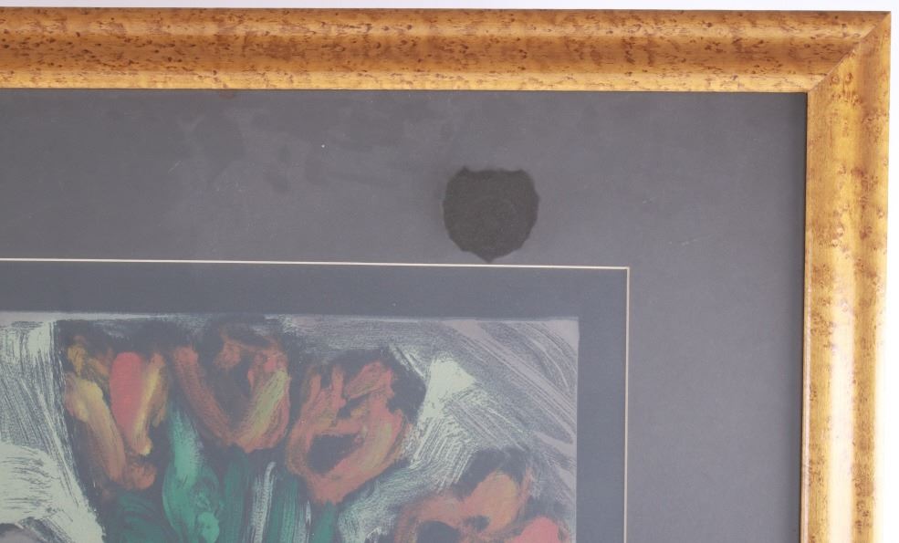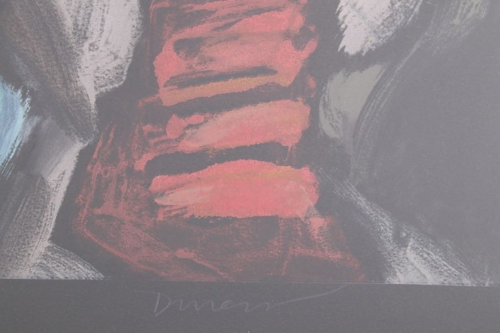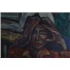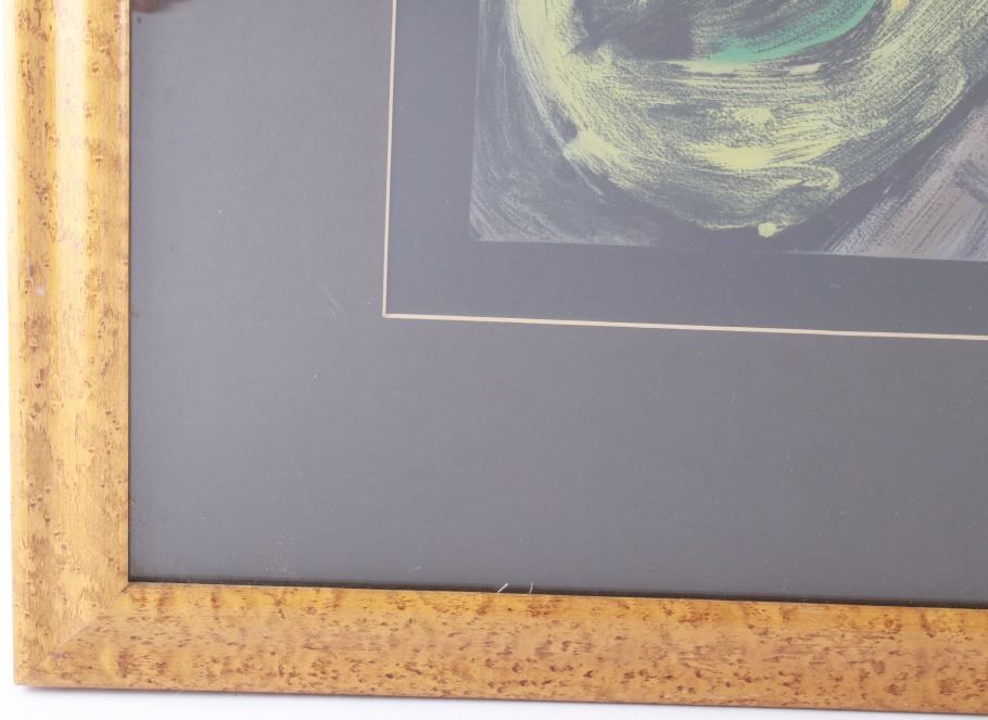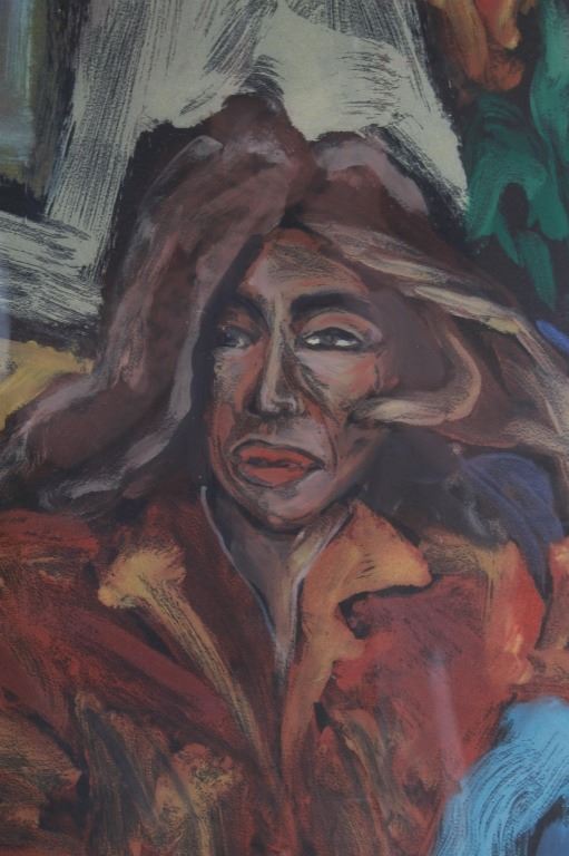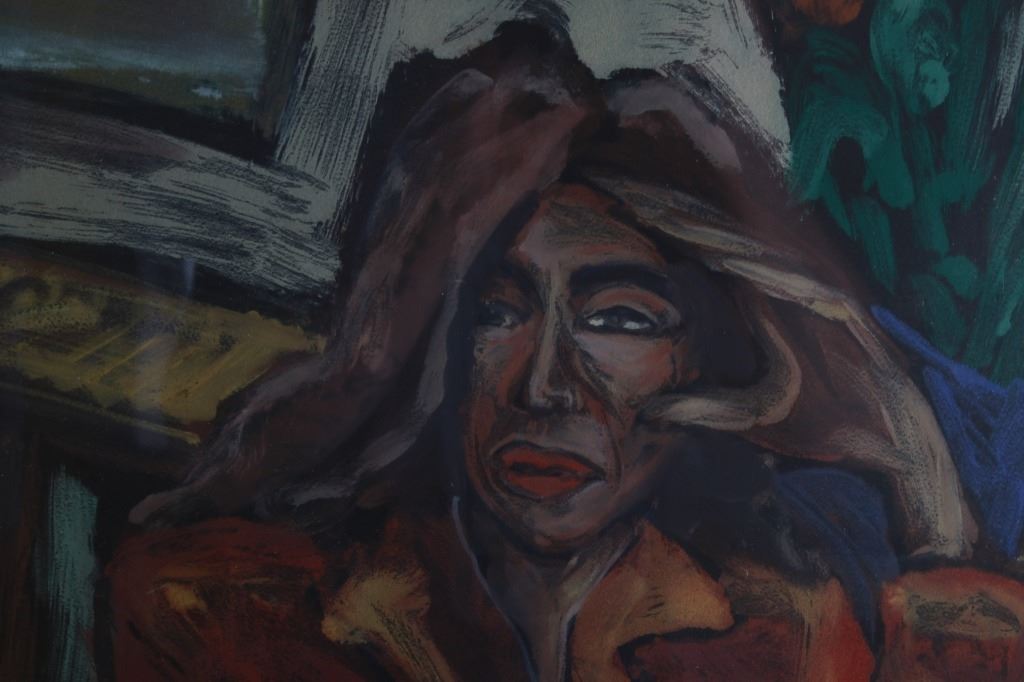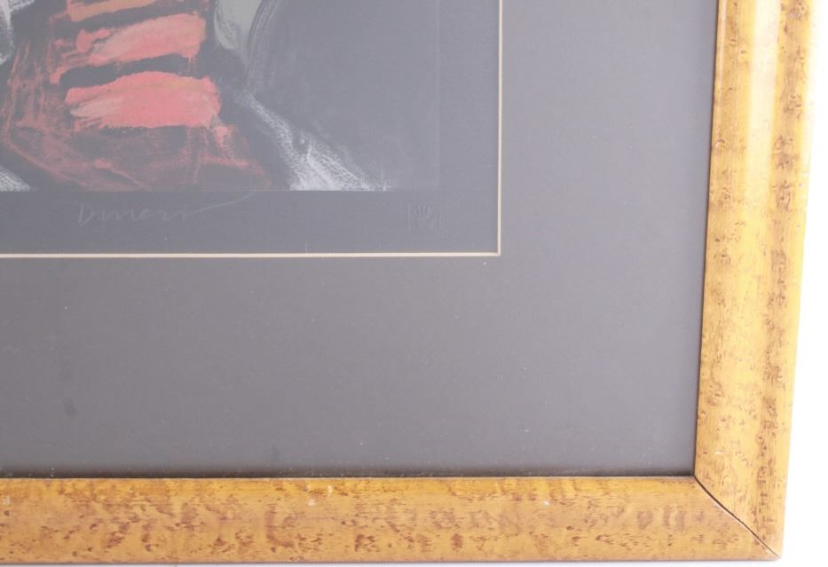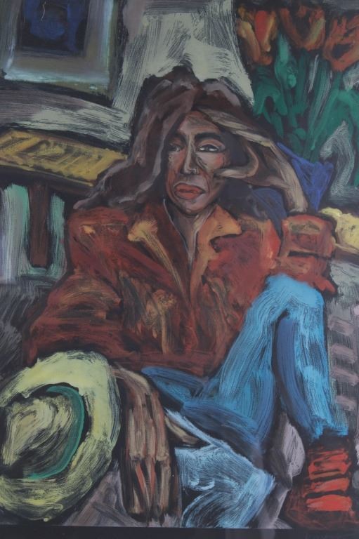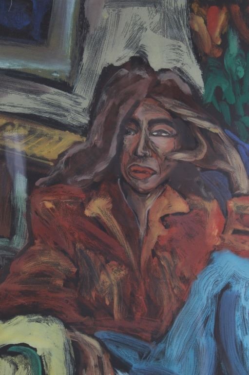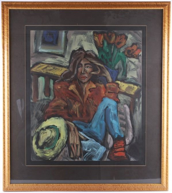 For your consideration in this lot is a modern impressionist portrait of a woman in a chair. This wonderful pastel piece in bright colors. The frame is made of birds eye wood in a rich golden color. The mating is a dark brown that accents the bright primary colors in the portrait. The art is signed in the lower right corner "Duncan"? and has a "Blind Stamp". The "Dust paper" was removed (and replaced) from the back to try to find more artist information. The art is professionally matted and framed by Grey Goose Custom Framing. This piece is in very good condition. The shown art measures 31 1/4" x 35 3/4" and the frame measures 34 1/4" x 39"