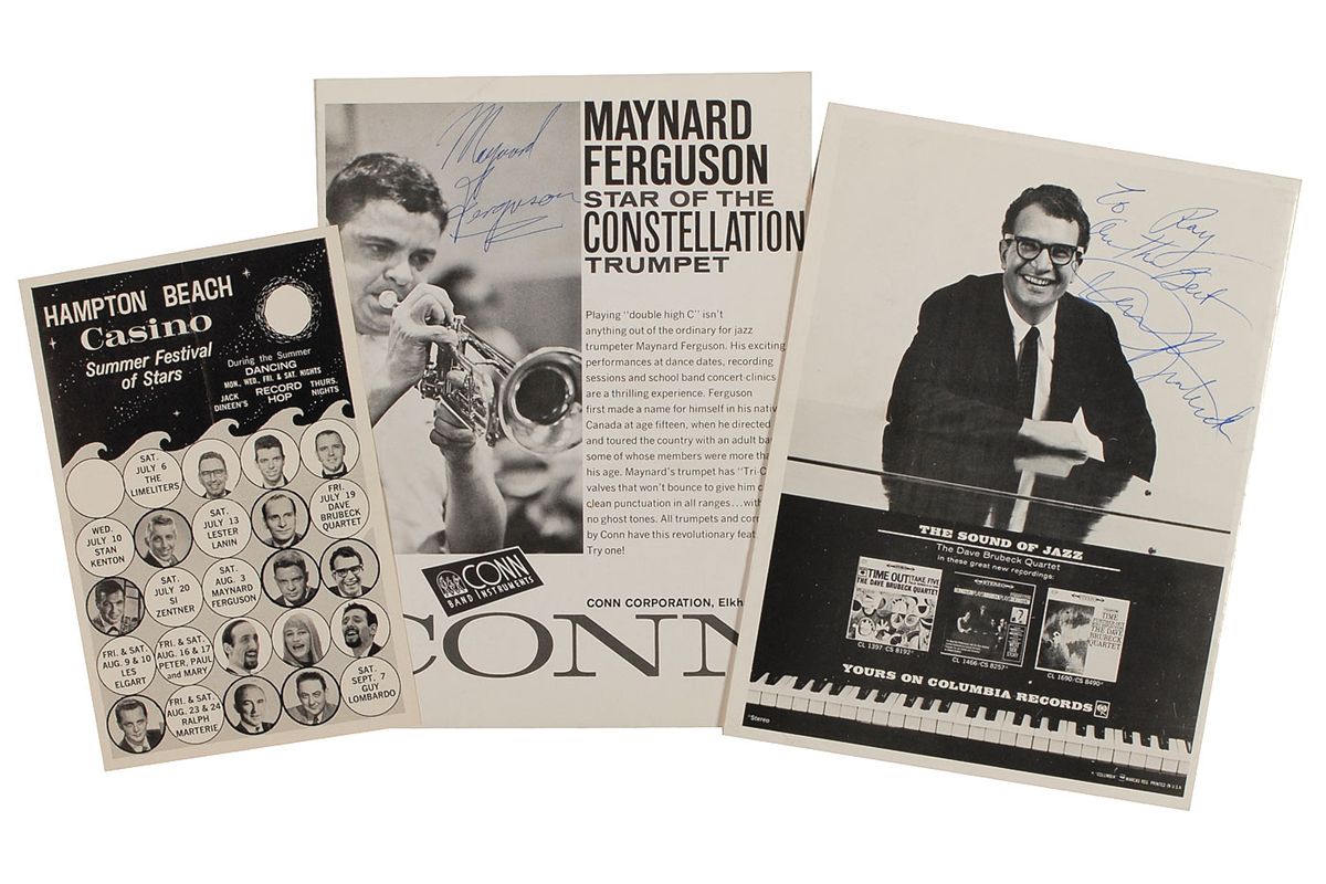 Two items: color program for the Dave Brubeck Quartet, 8.75 x 11.75, signed throughout in blue ballpoint by each member of the quartet, including Brubeck (ins, signing on the back cover), Paul Desmond, Gene Wright, and Joe Morello; and a program for Maynard Ferguson, Star of the Constellation Trumpet, 9 x 12, signed on the front in blue ballpoint. In fine condition, with some trivial rubbing to the covers. Accompanied by an original flier for the Hampton Beach Casino Summer Festival of Stars.