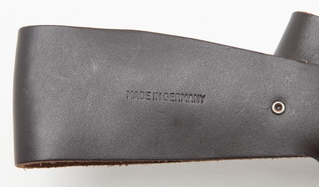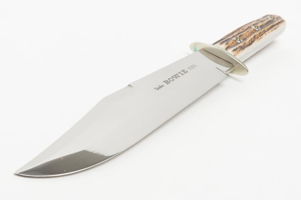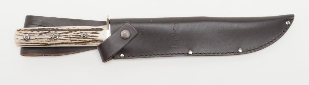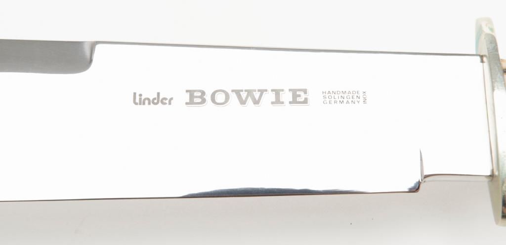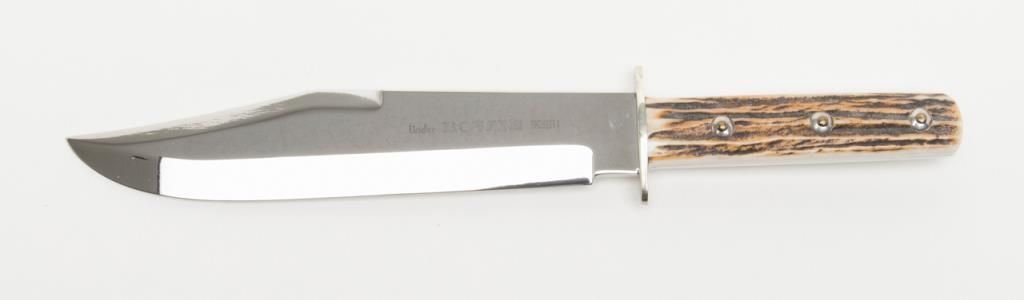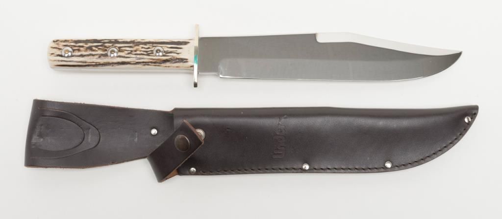 Modern Linder Bowie knife, made in Germany, approx. 15” overall with a 10” blade and stag grip; in fine condition with brown leather sheath. Est.: $50-$100
