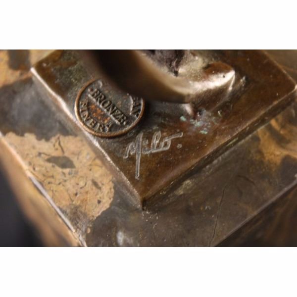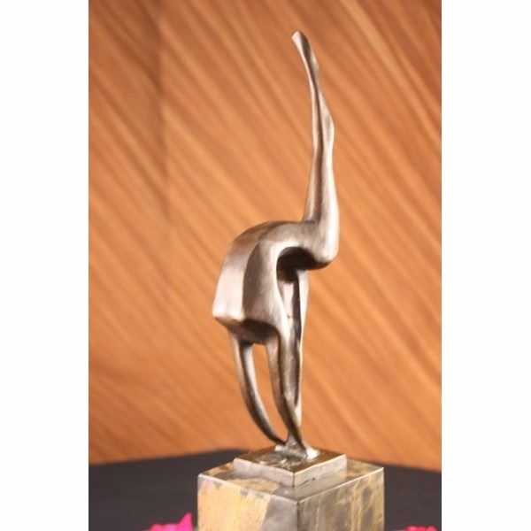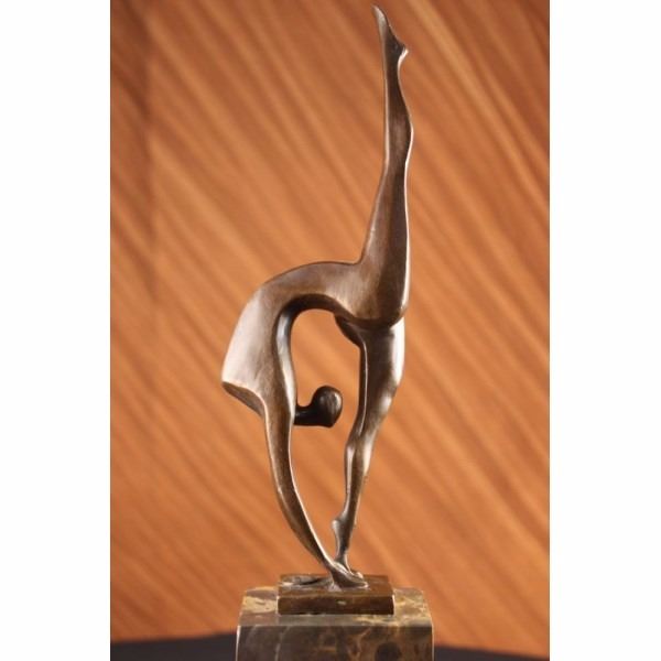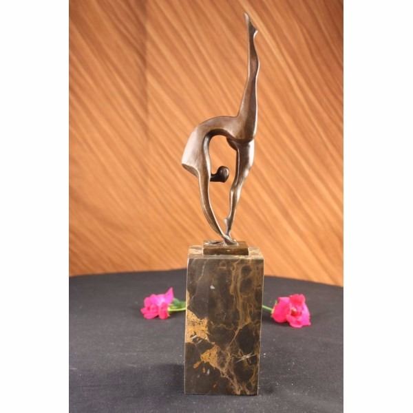 With grace, agility and flexibility,this abstract gymnast competes for gold. Her body moves fluidly as she curves backwards and touches the mat. Though her body is slender, she packs a lot of energy and strength. She balances on one leg, while extending the other long lean leg to the sky. 100% bronze and handmade, this brown patina sculpture was cast using the "Lost Wax Method" and mounted on a marble base and is signed by artist Milo. Condition: This sculpture is in very good condition. Bronze Dimensions with Marble Base:Height 14" X Width 6" Marble Dimensions: 3" X 3" Height without base: 9" Weight : 6 LBS Inventory : 63-B7132036