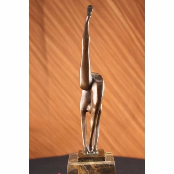 With grace, agility and flexibility, this abstract gymnast competes for gold. Her body moves fluidly as she curves backwards and touches the mat. Though her body is slender, she packs a lot of energy and strength. She balances on one leg, while extending the other long lean leg to the sky. This brown patina sculpture was cast using the lost wax method and mounted on a marble base. Bronze dimensions with marble base: Height 14 X Width 6 inches. Weight: 6 lbs.