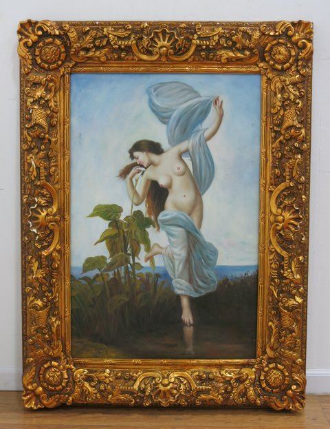Gilded frame. Approx. 36" H x 24" W image, 47" H x 35" W framed. (4135)