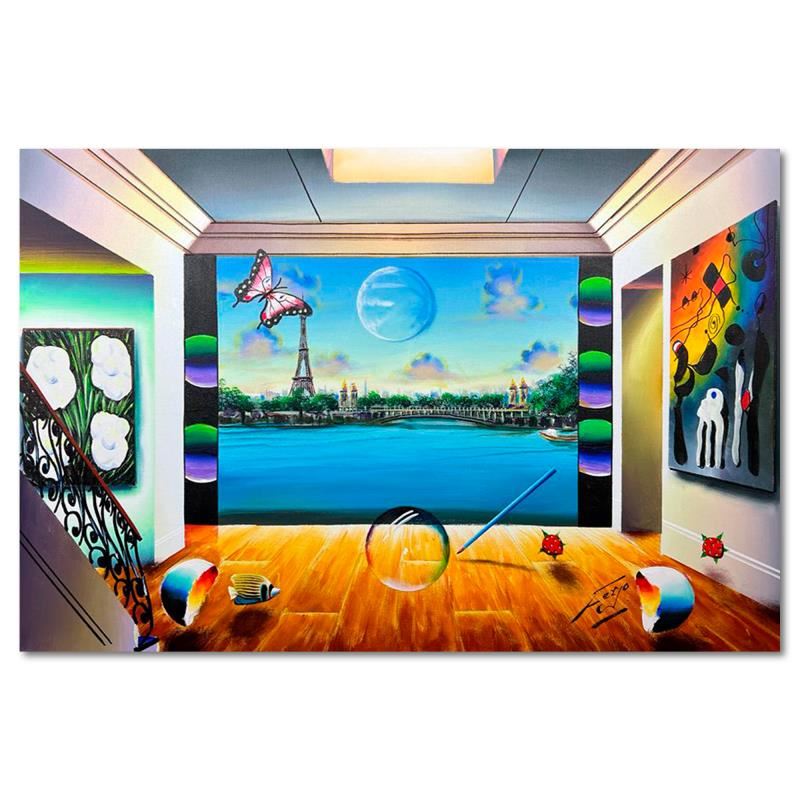 "Modern Paris" is an original painting, oil on stretched canvas, by Ferjo. Hand signed by the artist, this piece comes with a letter of authenticity. Measures approximately 36" x 24" (image). There may be very minor imperfections on the corners and edges that will be concealed when framed.