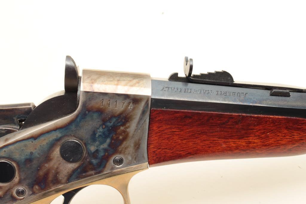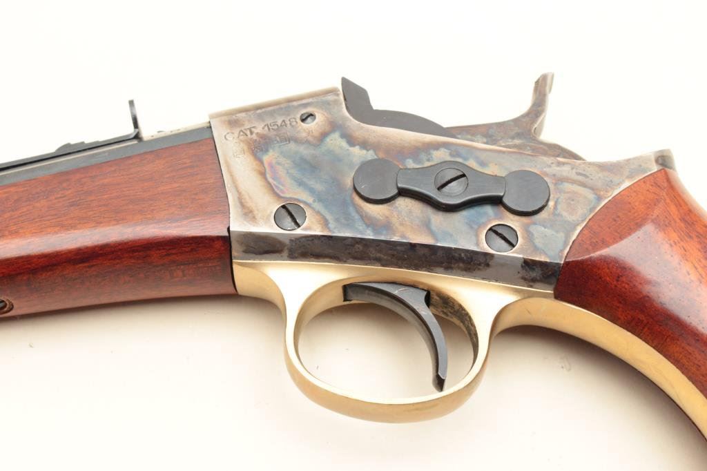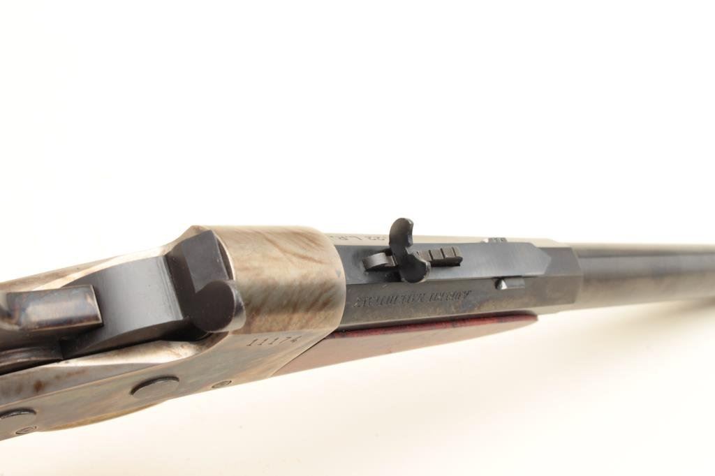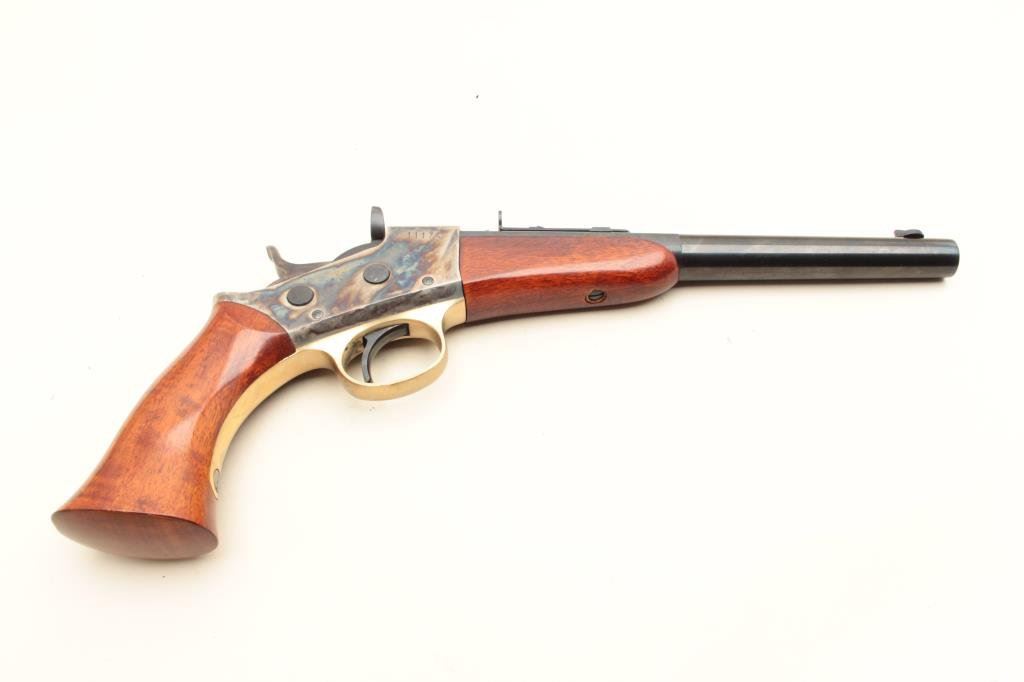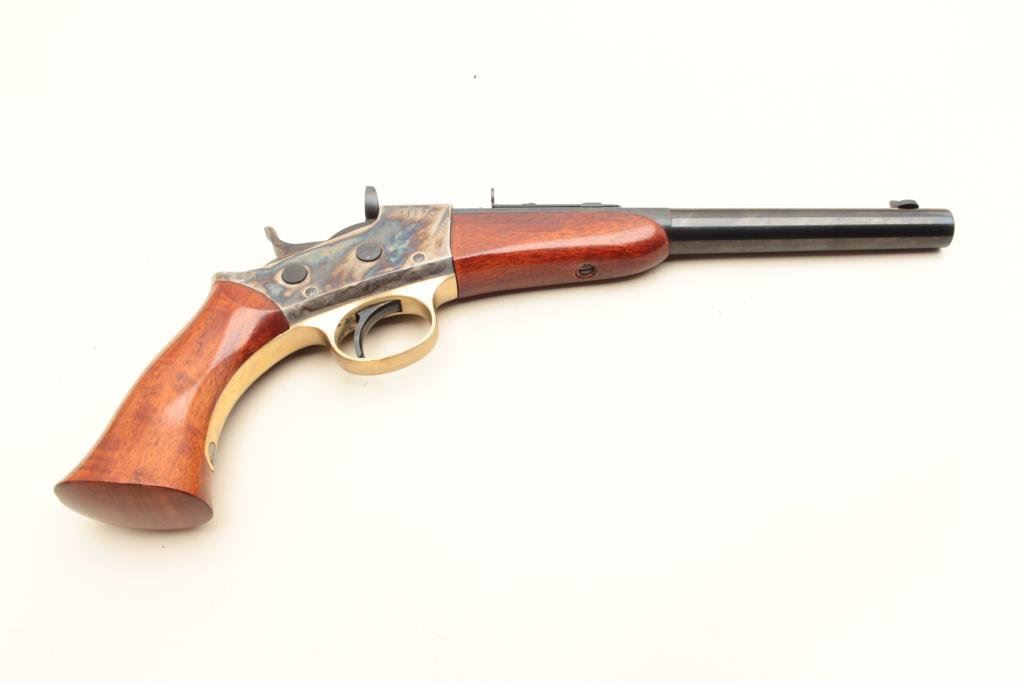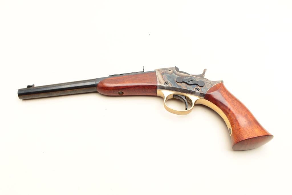 9.5” barrel, blued and case hardened finish, wood stocks, S/N 11174, in overall fine to excellent condition displaying majority of original blue and case colors, bore should clean to very good, crisp action, sharp markings and excellent wood; accompanied by factory cardboard box. (Modern/PPT). Est.: $150-$300.