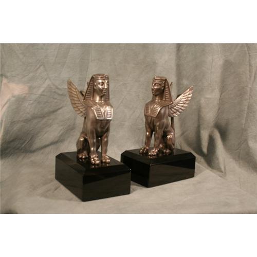 Modern Sculpture of Sphynxs on absolute black marble base Antique Silver patina sold in pairs. 8.5"ht x 4.4"Base.