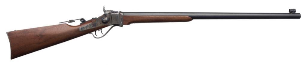 *Modern Shiloh Sharps Model 1874 single shot rifle, .45 2-1/10” caliber, 28” heavy round barrel, S/N B2358, mat black and case hardened finish, double set triggers, adjustable tang peep sight and hooded front sight; wood stocks. This rifle is in fine condition displaying the majority of its original finish, fine bore, action, markings and wood. Est.: $800-$1,600.
